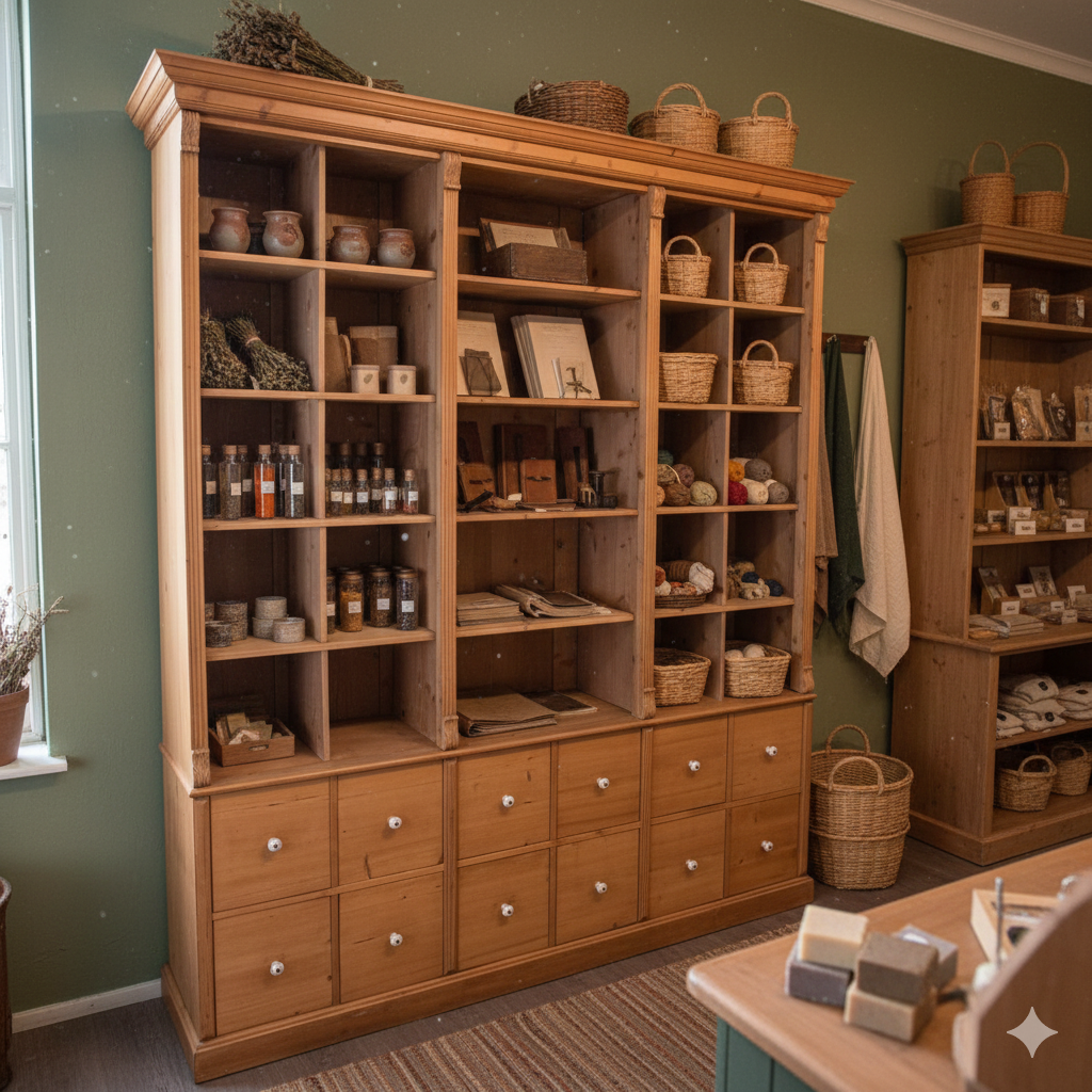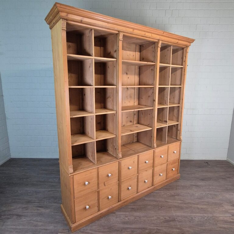 Restaurierter Ladenschrank hergestellt aus massiv Kiefer (gewachst). Der Schrank befindet sich in einem sehr guten Zustand und weist nur minimale Gebrauchsspuren auf. Zerlegbar (2-teilig).   20 Regalboden 12 Schubladen Massivholz zerlegbar Gründerzeitstil   Maße:   Breite 2,10 m Höhe 2,38 m Tiefe 0,47 m