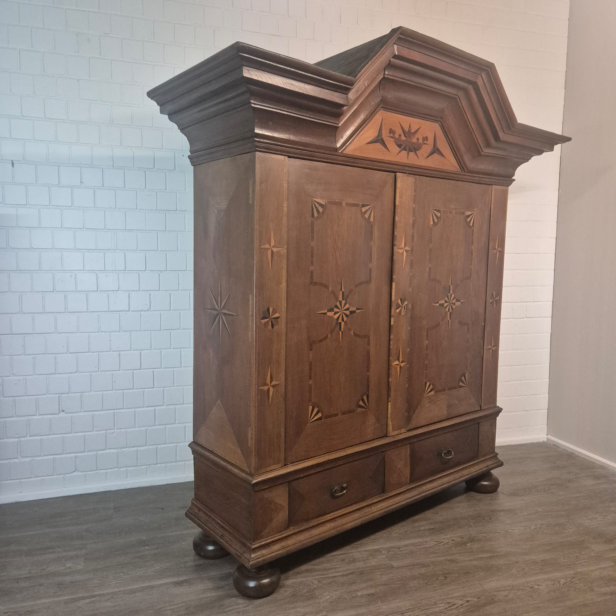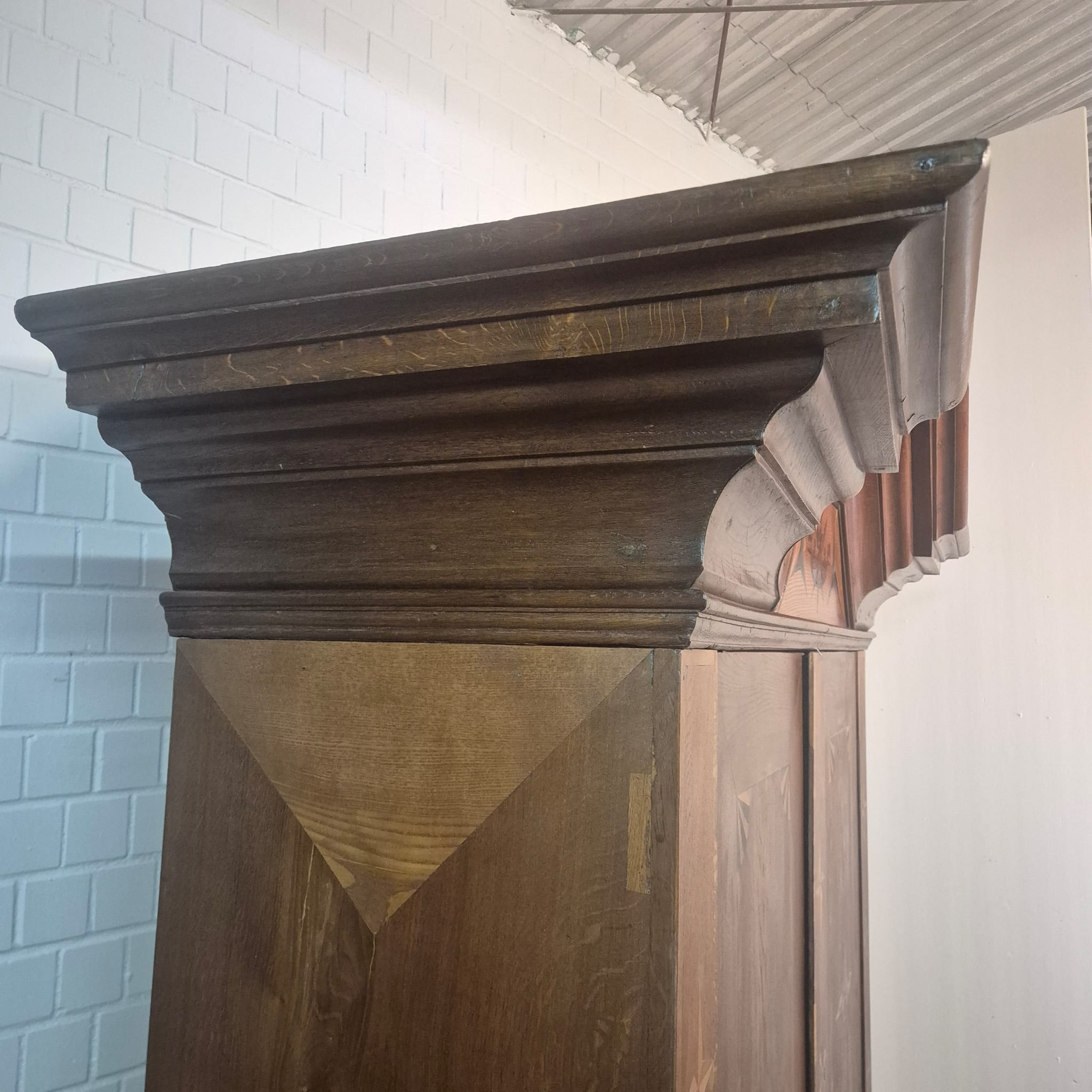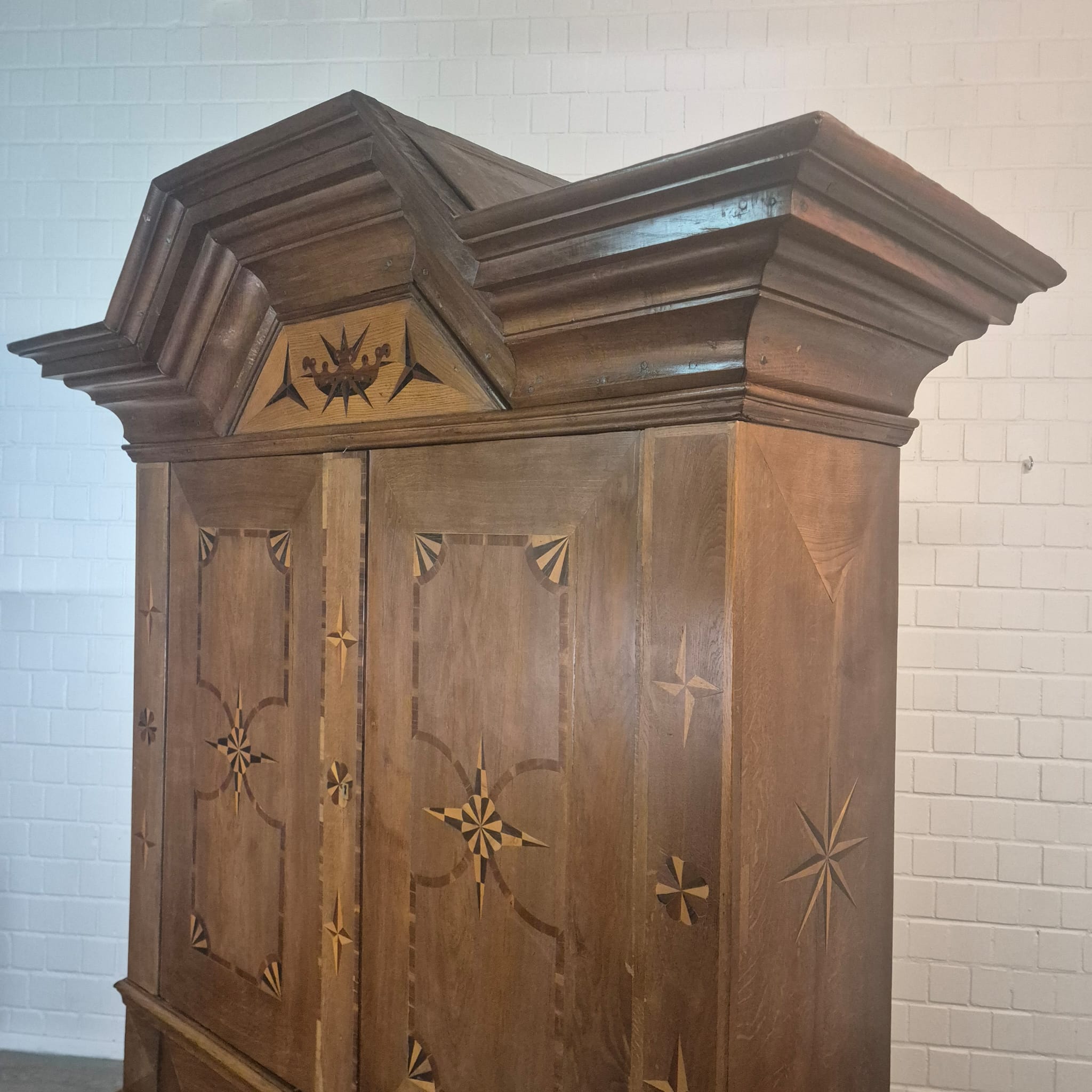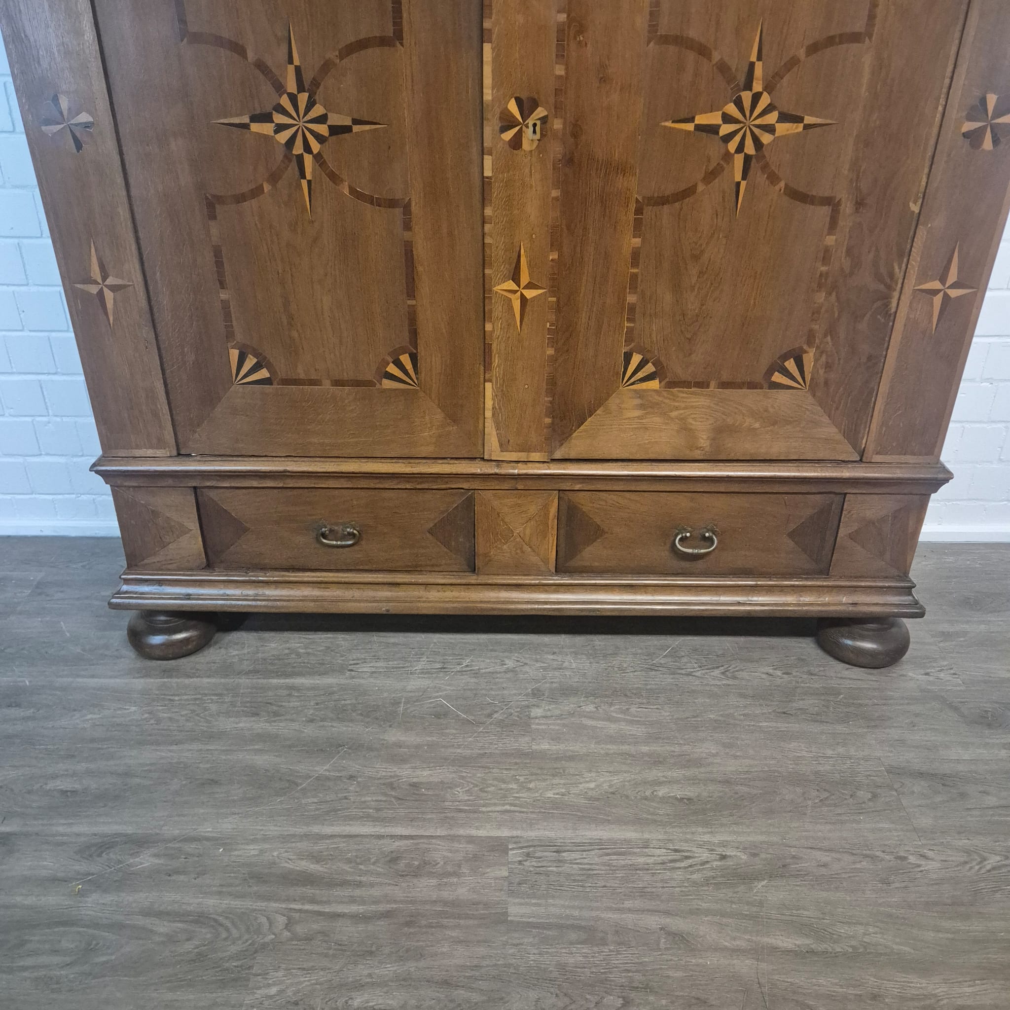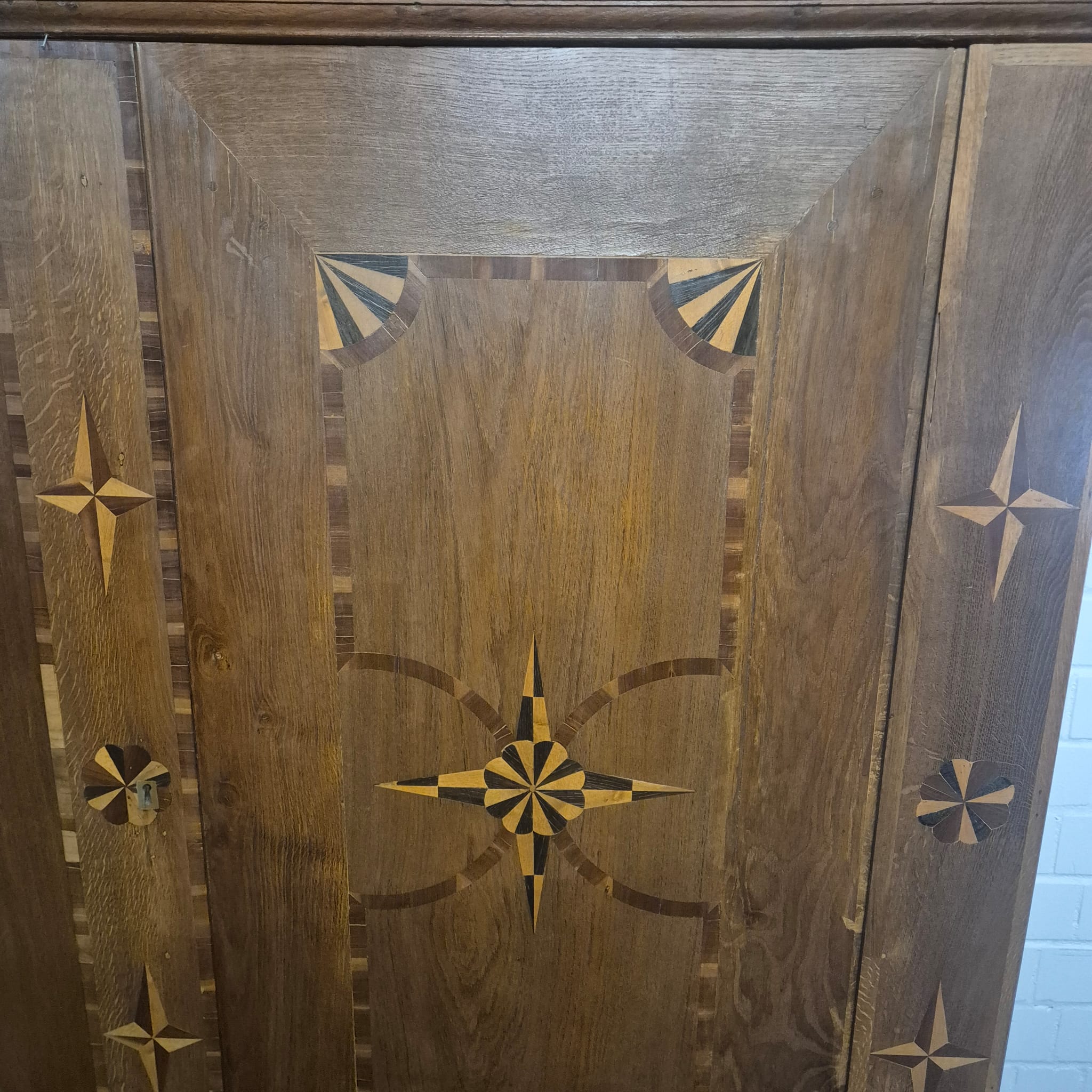 Armadio Barocco di Danzica restaurato, realizzato in quercia massiccia e impiallacciato in noce (cerato), risalente al 1770 circa. L'armadio, decorato con intarsi, è in ottime condizioni e presenta solo minimi segni d'usura. Completamente smontabile (8 pezzi).