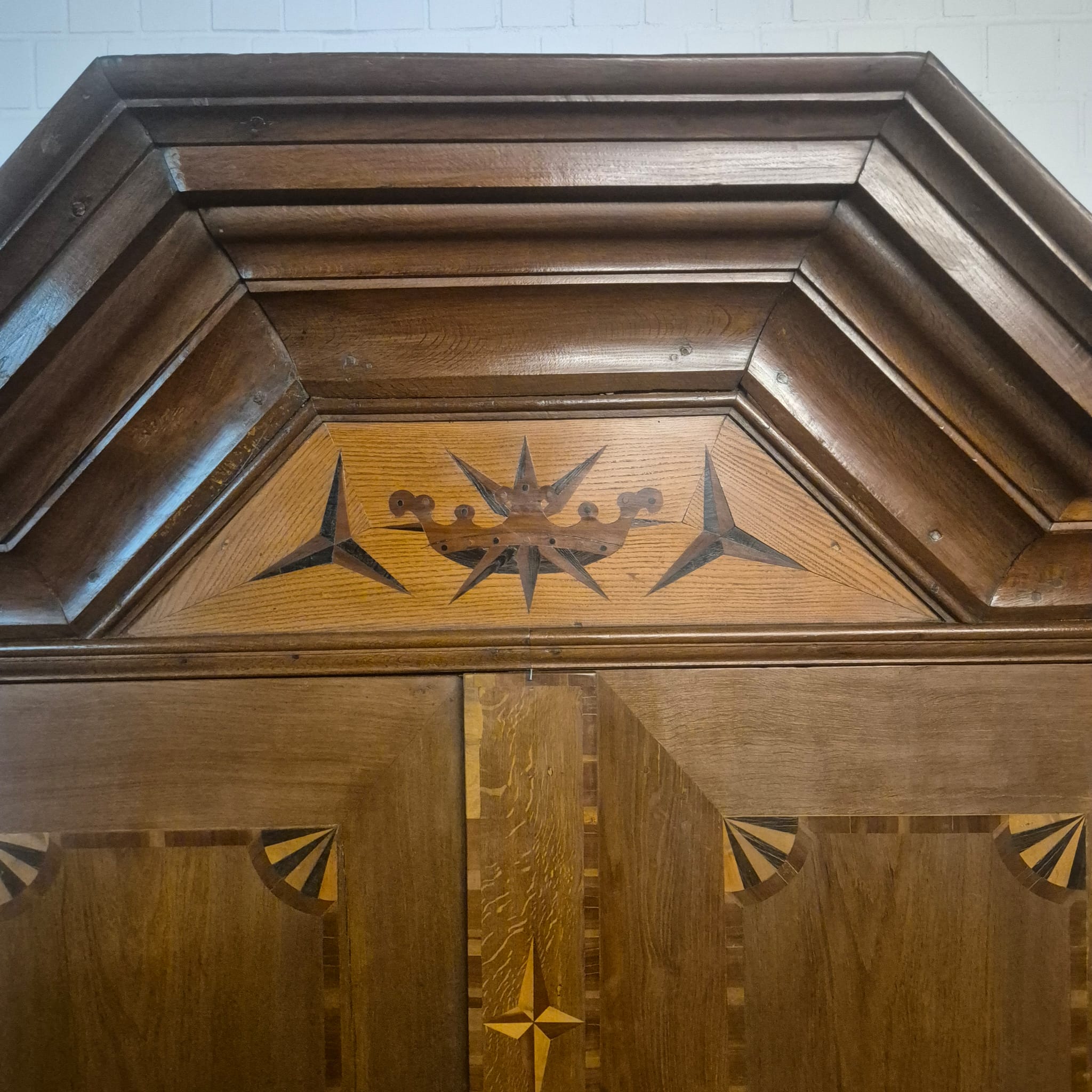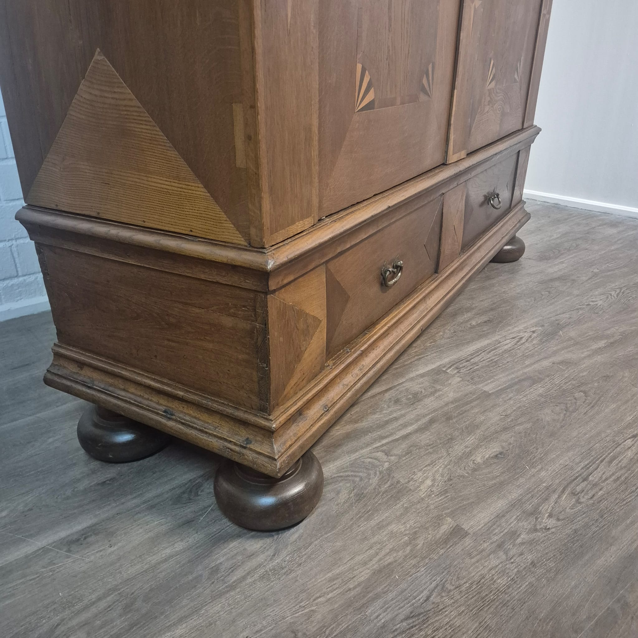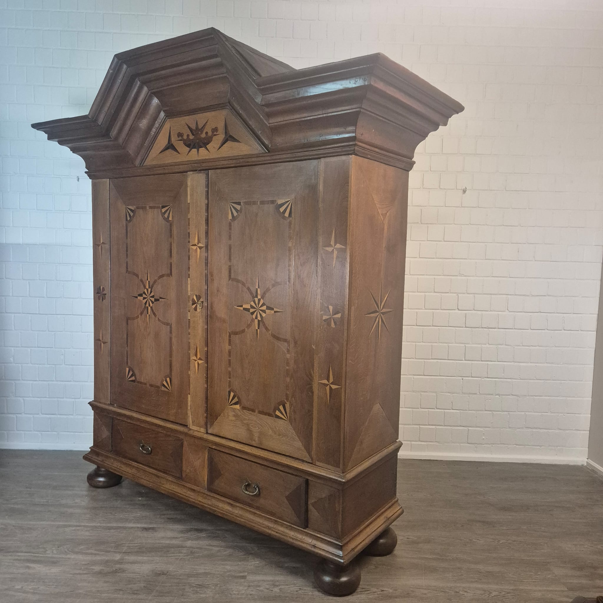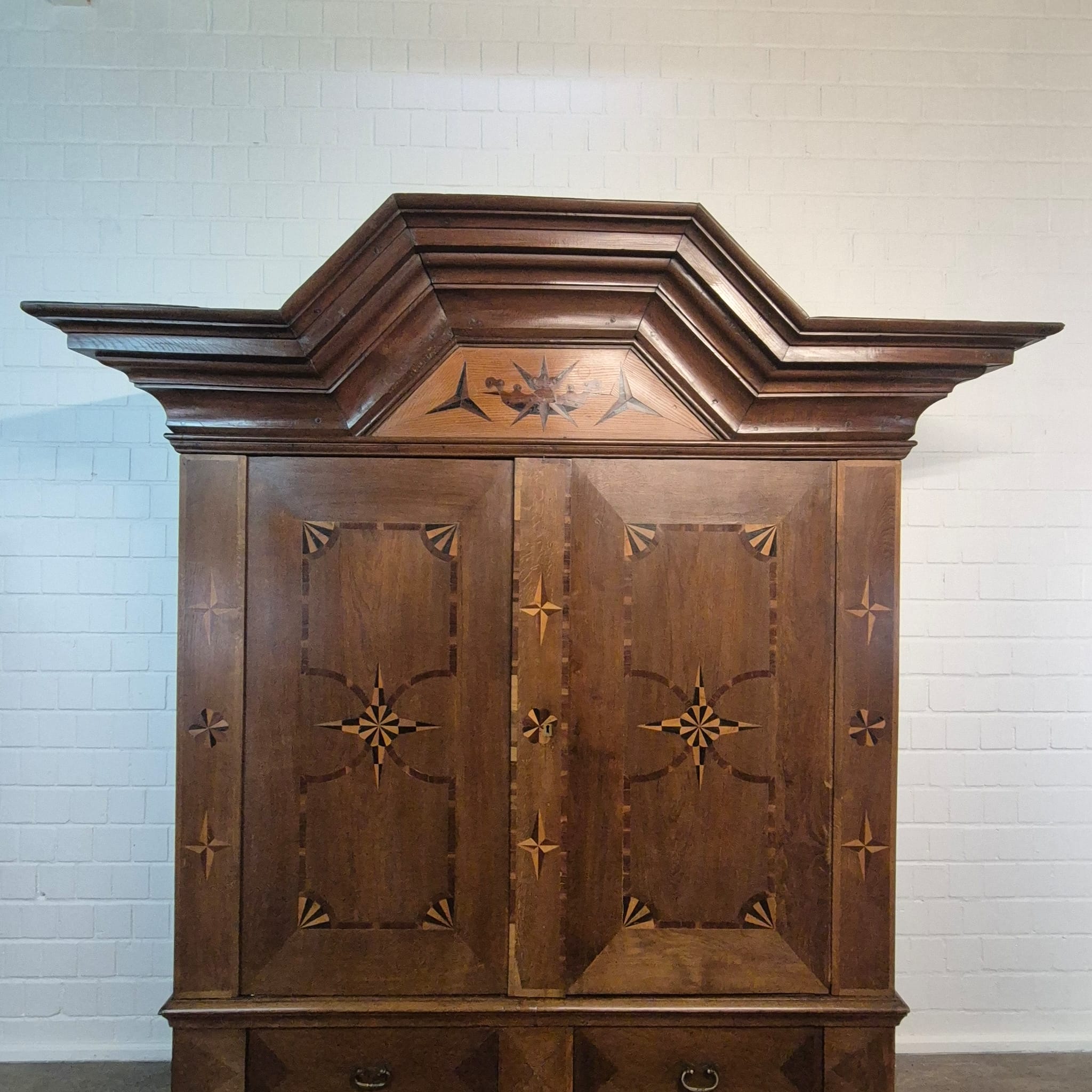 Armadio Barocco di Danzica restaurato, realizzato in quercia massiccia e impiallacciato in noce (cerato), risalente al 1770 circa. L'armadio, decorato con intarsi, è in ottime condizioni e presenta solo minimi segni d'usura. Completamente smontabile (8 pezzi).