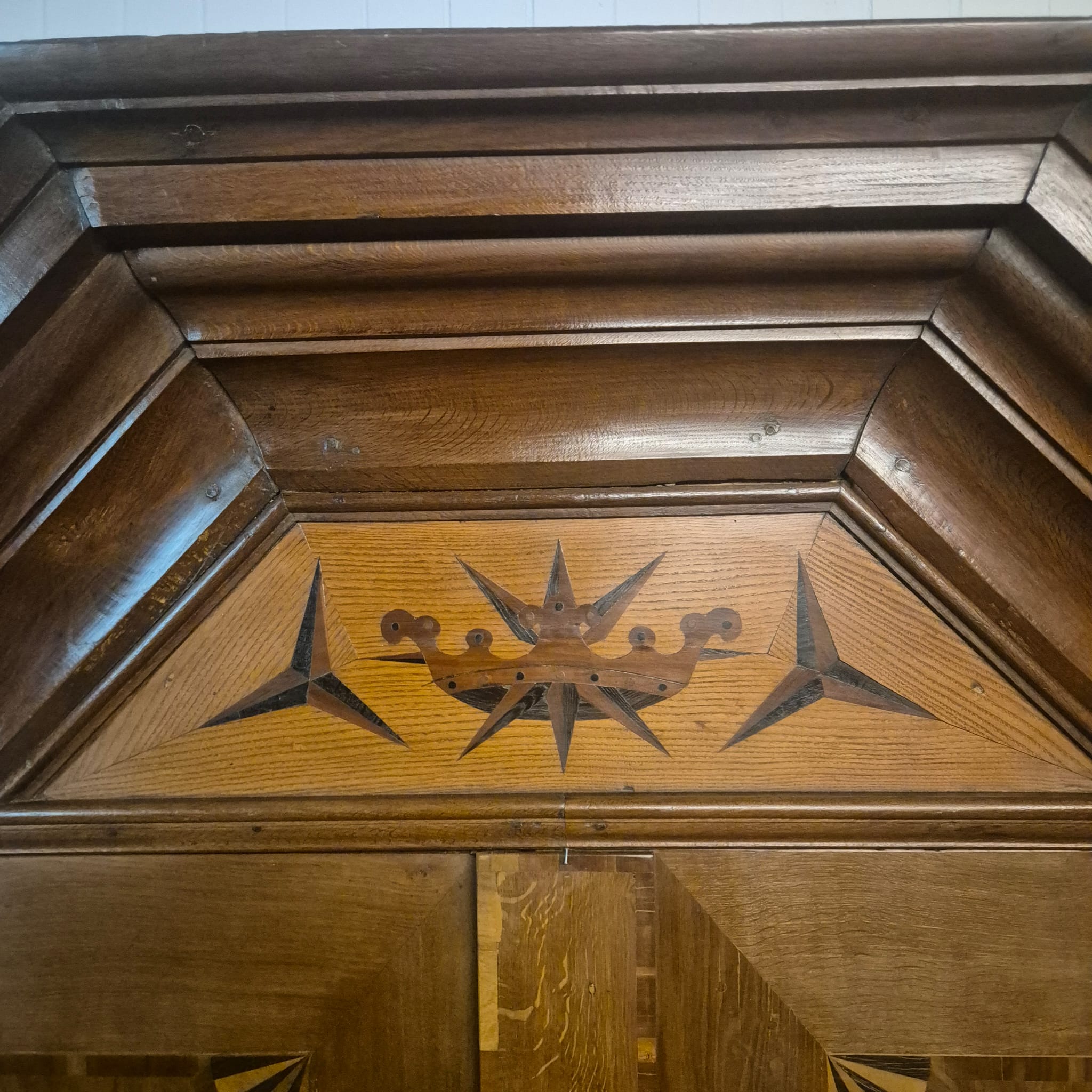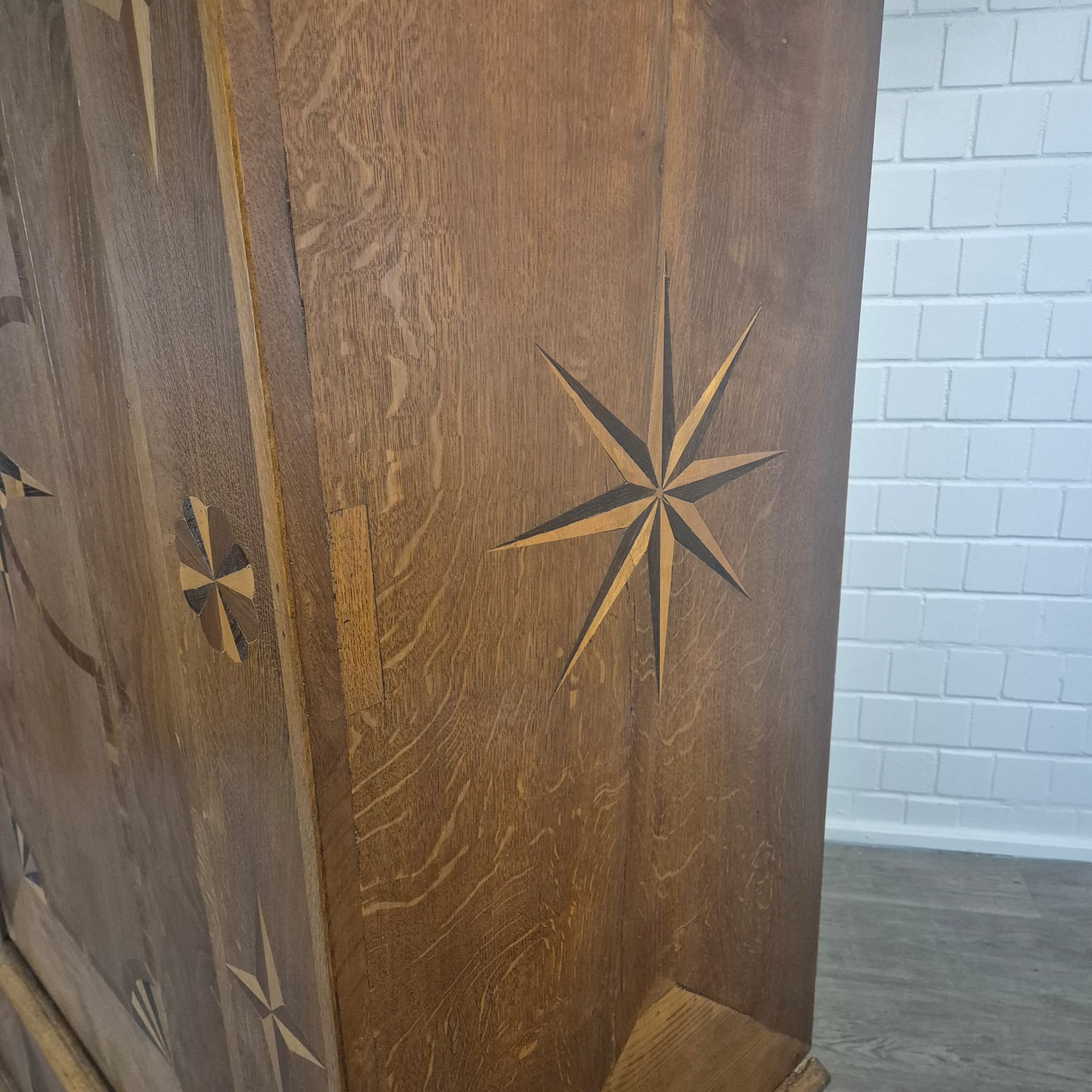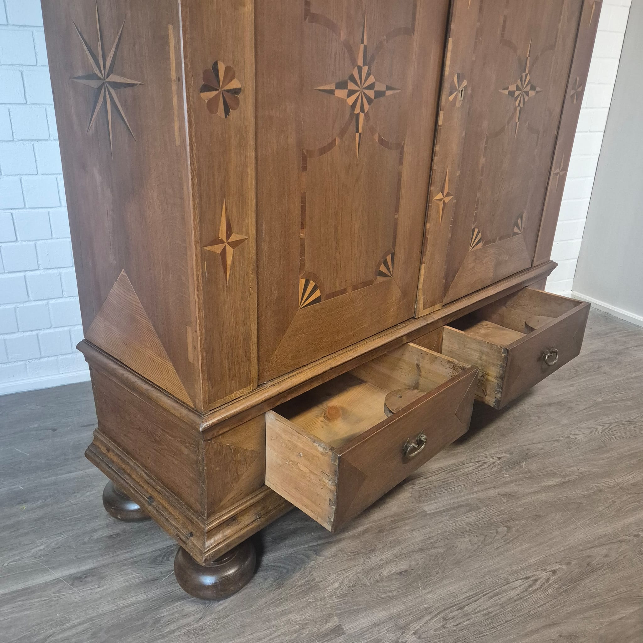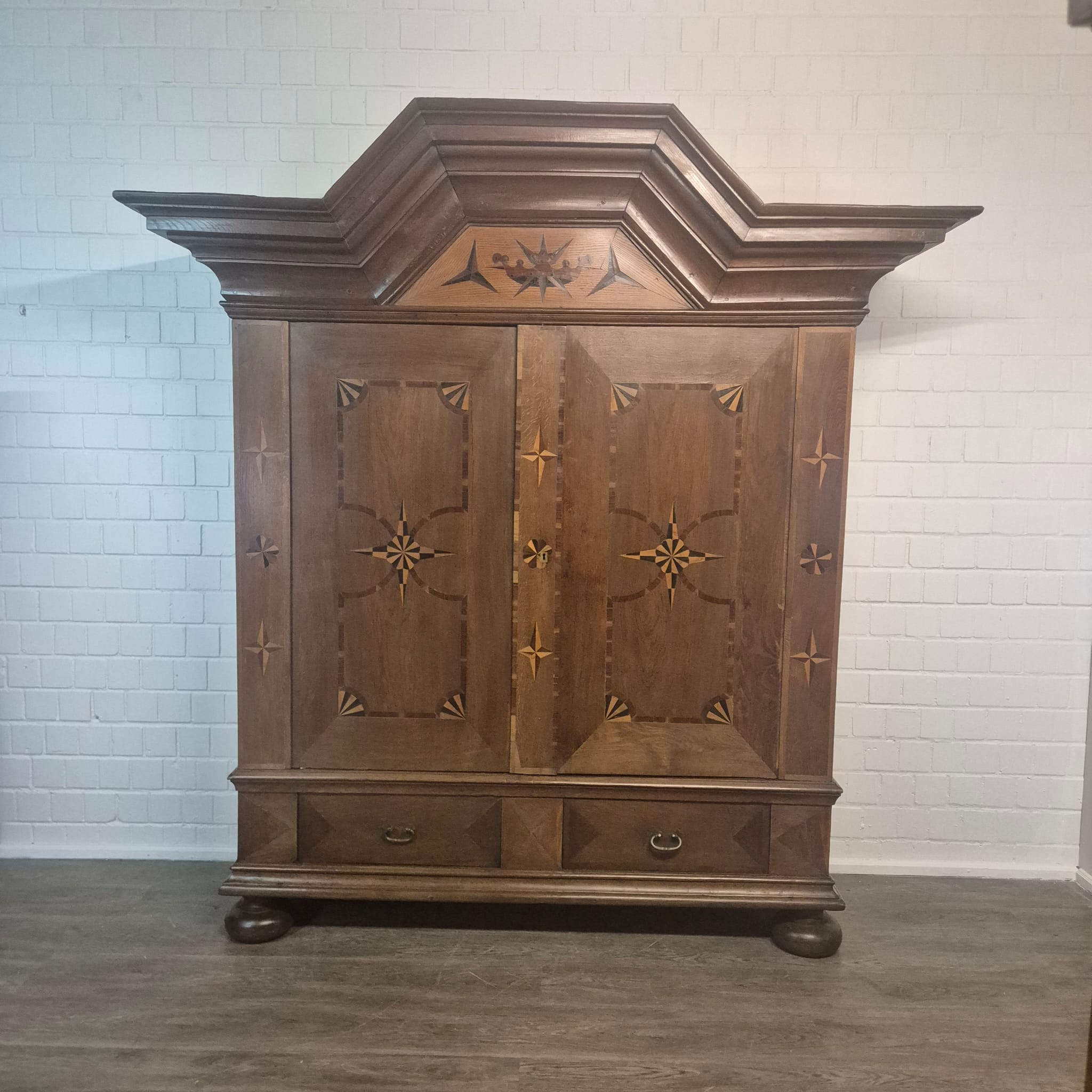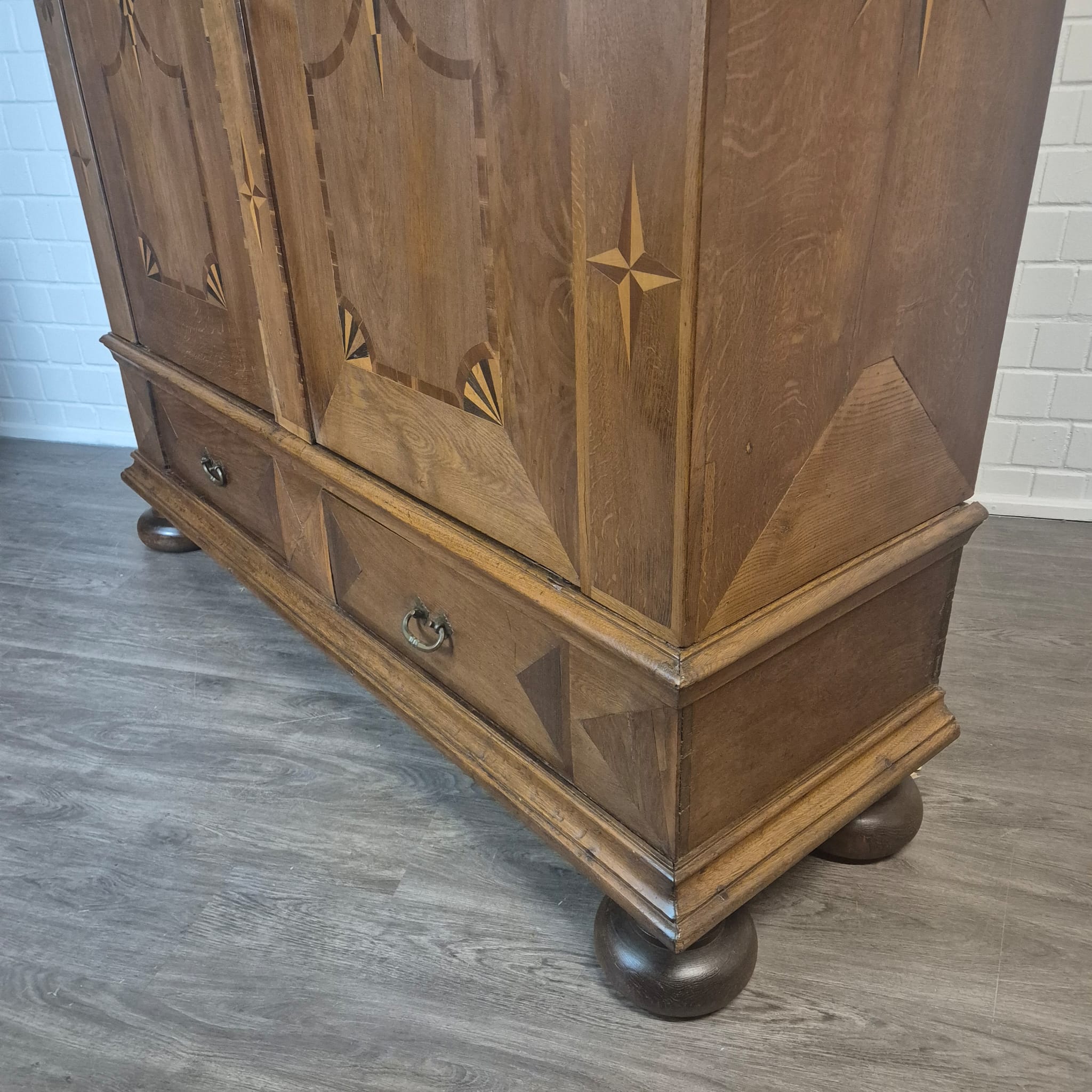 Armadio Barocco di Danzica restaurato, realizzato in quercia massiccia e impiallacciato in noce (cerato), risalente al 1770 circa. L'armadio, decorato con intarsi, è in ottime condizioni e presenta solo minimi segni d'usura. Completamente smontabile (8 pezzi).