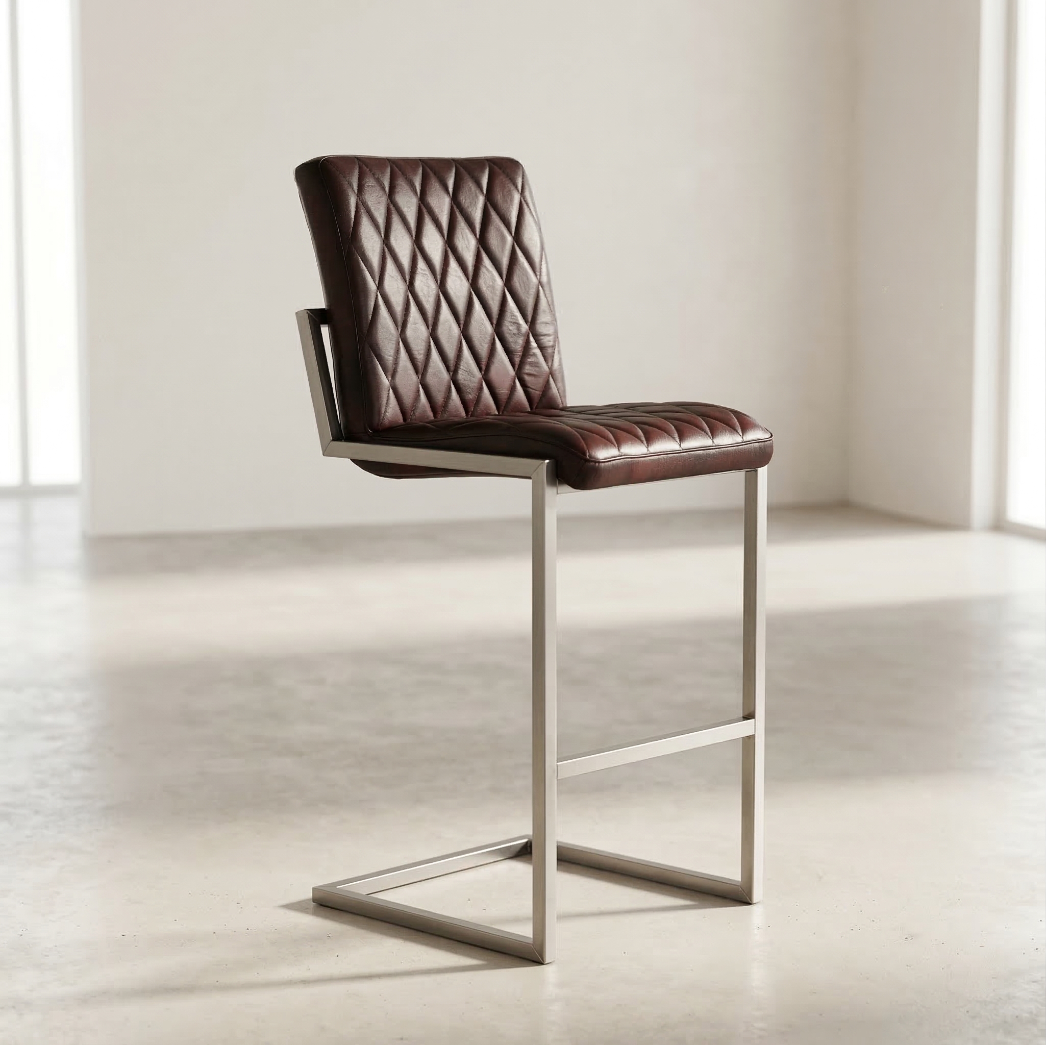 Modern gestalteter Barhocker mit einem Gestell aus Stahl und Bezug aus hochwertigen Rindsleder.