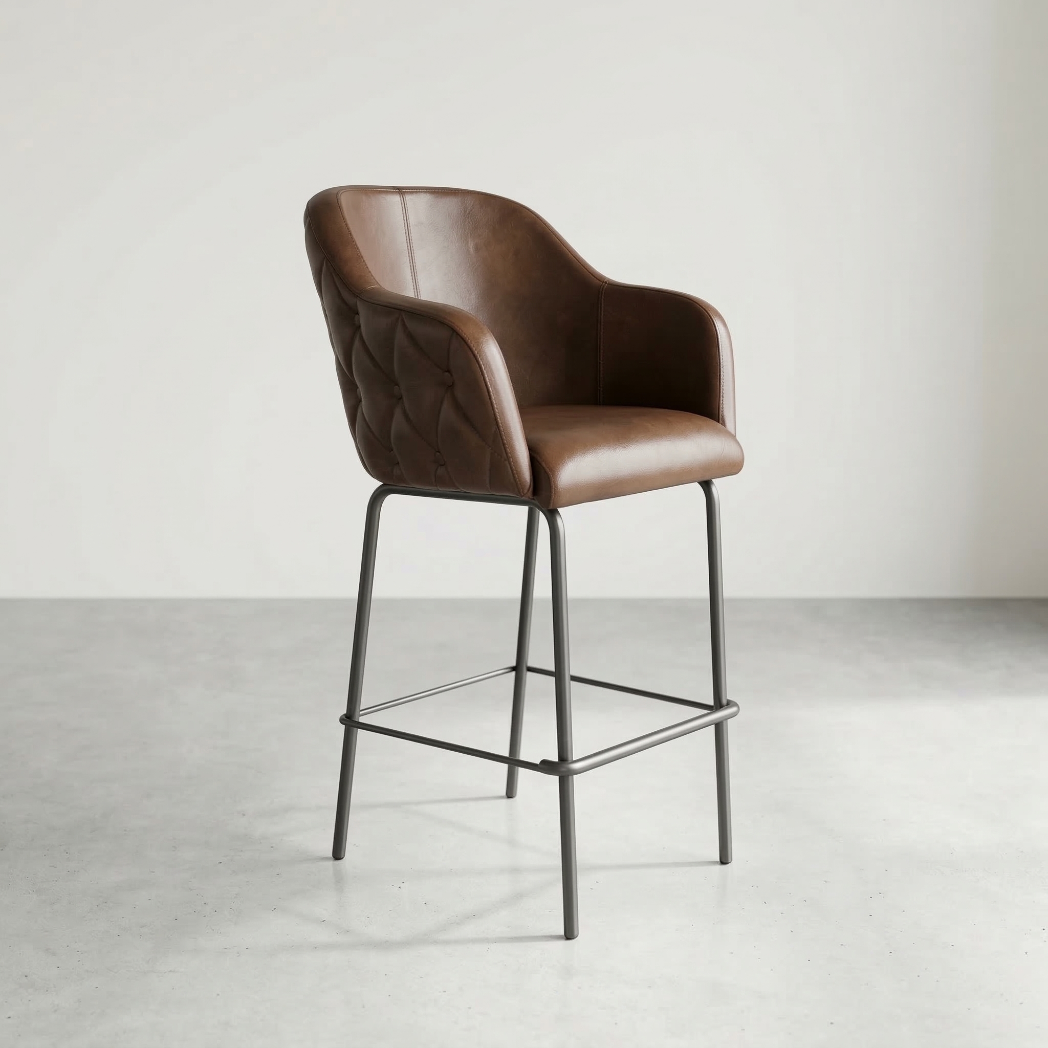 Diese Barhocker bieten eine perfekte Kombination aus optischer Eleganz und qualitativ hochwertiger Verarbeitung. Die ergonomisch geformten Lehnen passt sich dem Rücken an und ermöglichen ein bequemes Sitzen. Auch sind die Barhocker mit Fußstützen an den Stuhlbeinen ausgestattet. Die Sitzflächen sowie Rückenlehnen wurden mit Leder bezogen, die Gestelle wurde aus Metall hergestellt.