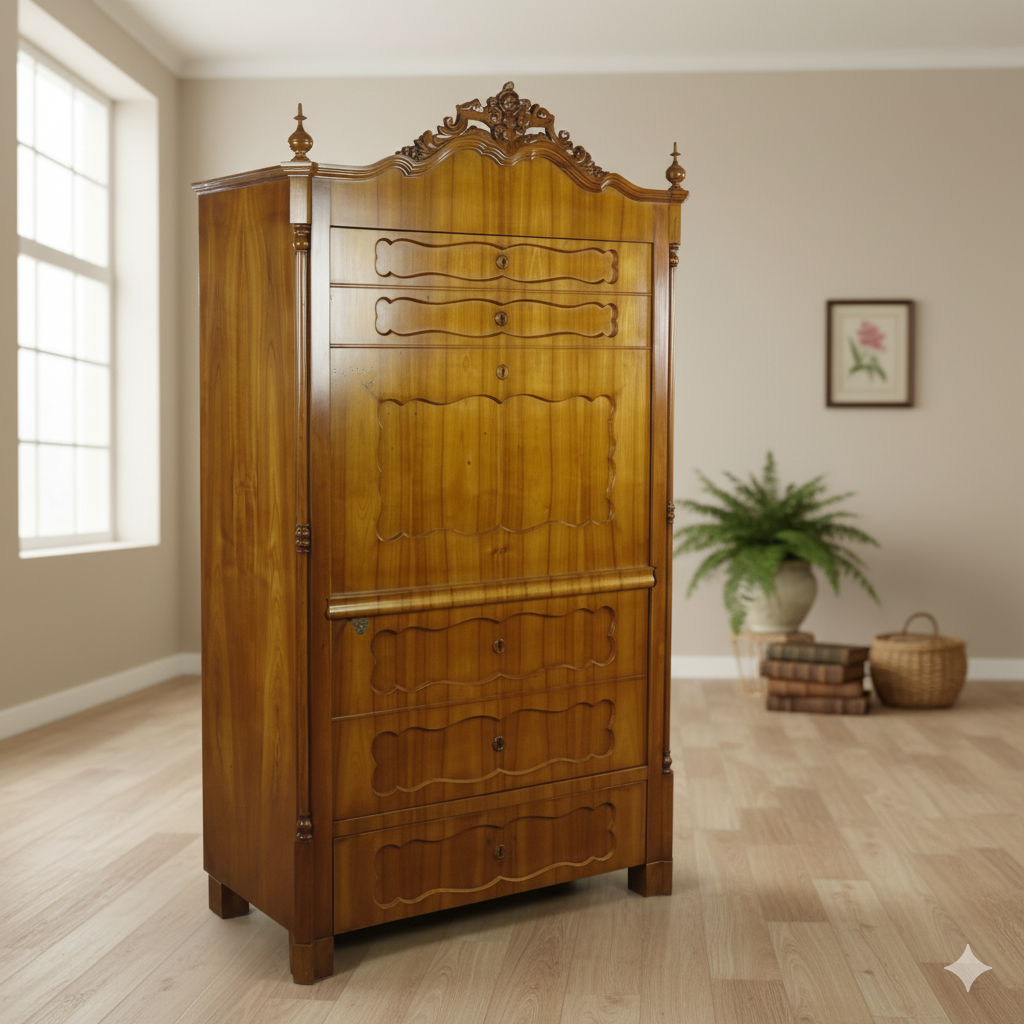 Restaurierter Biedermeier Schrank in Kirschbaum furniert und von Grund auf Schellack poliert von ca. 1850. Der Schrank befindet sich in einem sehr guten Zustand und weist nur geringe Gebrauchsspuren auf. Er ist frei von Wurmbefall. • 1 Schublade • 3 Regalboden • Kirschbaum Furnier • Schellack poliert • Biedermeier 1850 Maße: Breite 1,04 m Höhe … Weiterlesen