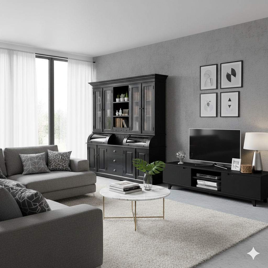 Stilvoller Schrank mit hoher Funktionalität aus Teakholz (schwarz lackiert). Machart und Farbton des Holzes tragen sehr zum optischen Wert dieses Möbels bei, das sowohl dekorative Möglichkeiten als auch genügend Stauraum bietet.  9 Schubladen 8 Regalboden 2 Staufächer hinter Klappe massiv Teakholz Maße: Breite 2,00 m Höhe 2,26 m Tiefe 0,52 m