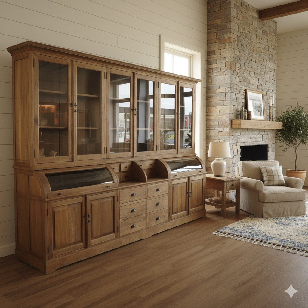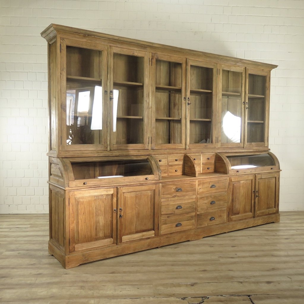 Stilvoller Schrank mit hoher Funktionalität aus Teakholz (Hartholz). Machart und Farbton des Holzes tragen sehr zum optischen Wert dieses Möbels bei, das sowohl dekorative Möglichkeiten als auch genügend Stauraum bietet. Zerlegbar (2-teilig). • 14 Schubladen • 8 Regalboden • 2 Staufächer hinter Klappe • massiv Teakholz Maße: Breite 3,14 m Höhe 2,20 m Tiefe 0,53 … Weiterlesen