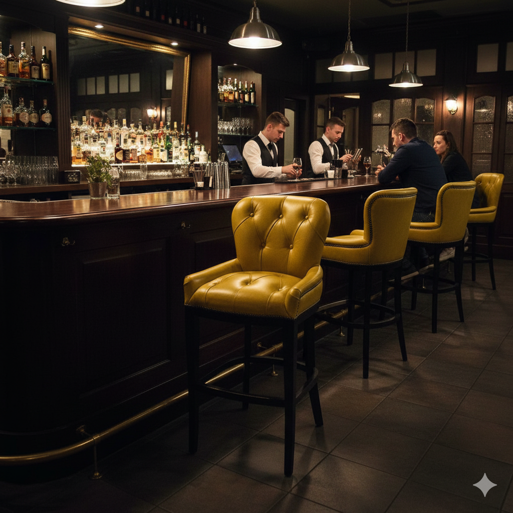 Hochwertiger Barhocker bezogen mit echtem Rindsleder nach Chesterfield Art. Sitzkomfort für höchste Ansprüche.
