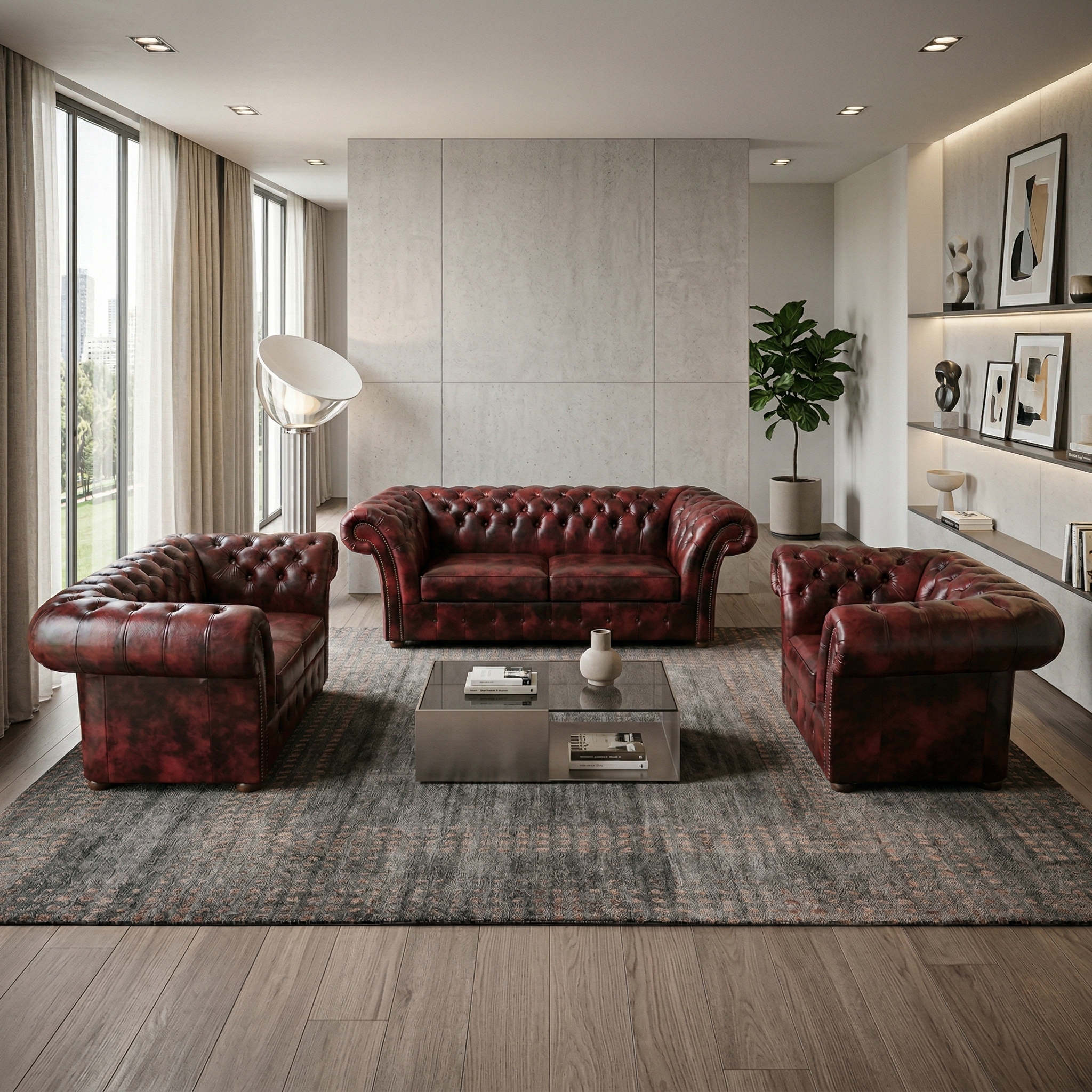 Chesterfield Couchgarnitur Dunkelrot-Schwarz 3-2-1 Leder