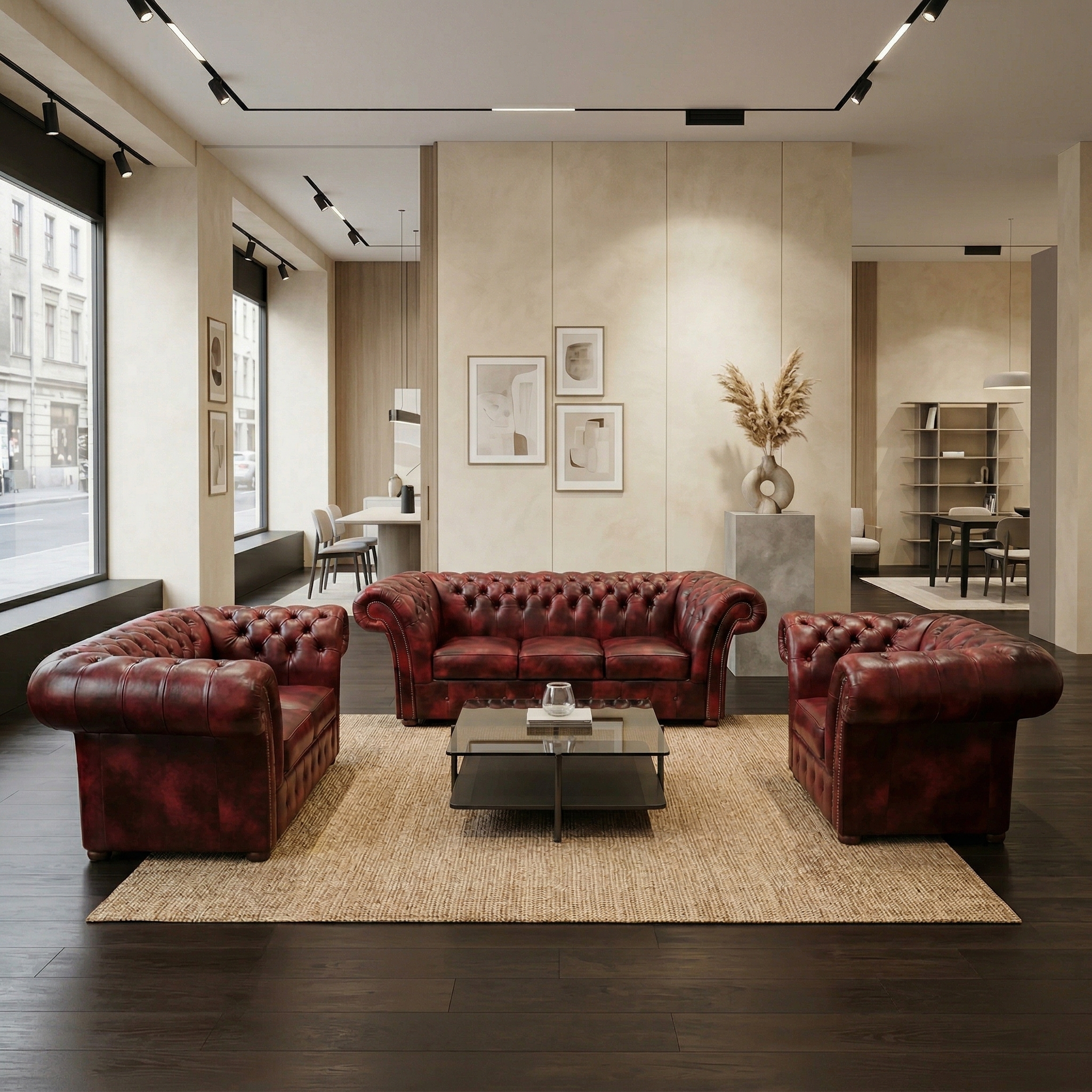 Stilvolle Chesterfield Couchgarnitur hergestellt aus echtem Leder in in klassischer Optik.  Maße Sofa 3-Sitzer:   Länge 2,20 m Breite 0,90 m Höhe 0,78 m Sitzhöhe 0,44 m Sitztiefe 0,54 m   Maße Sofa 2-Sitzer:   Länge 1,85 m Breite 0,90 m Höhe 0,78 m Sitzhöhe 0,44 m Sitztiefe 0,54 m   Maße Sessel:   Breite … Weiterlesen