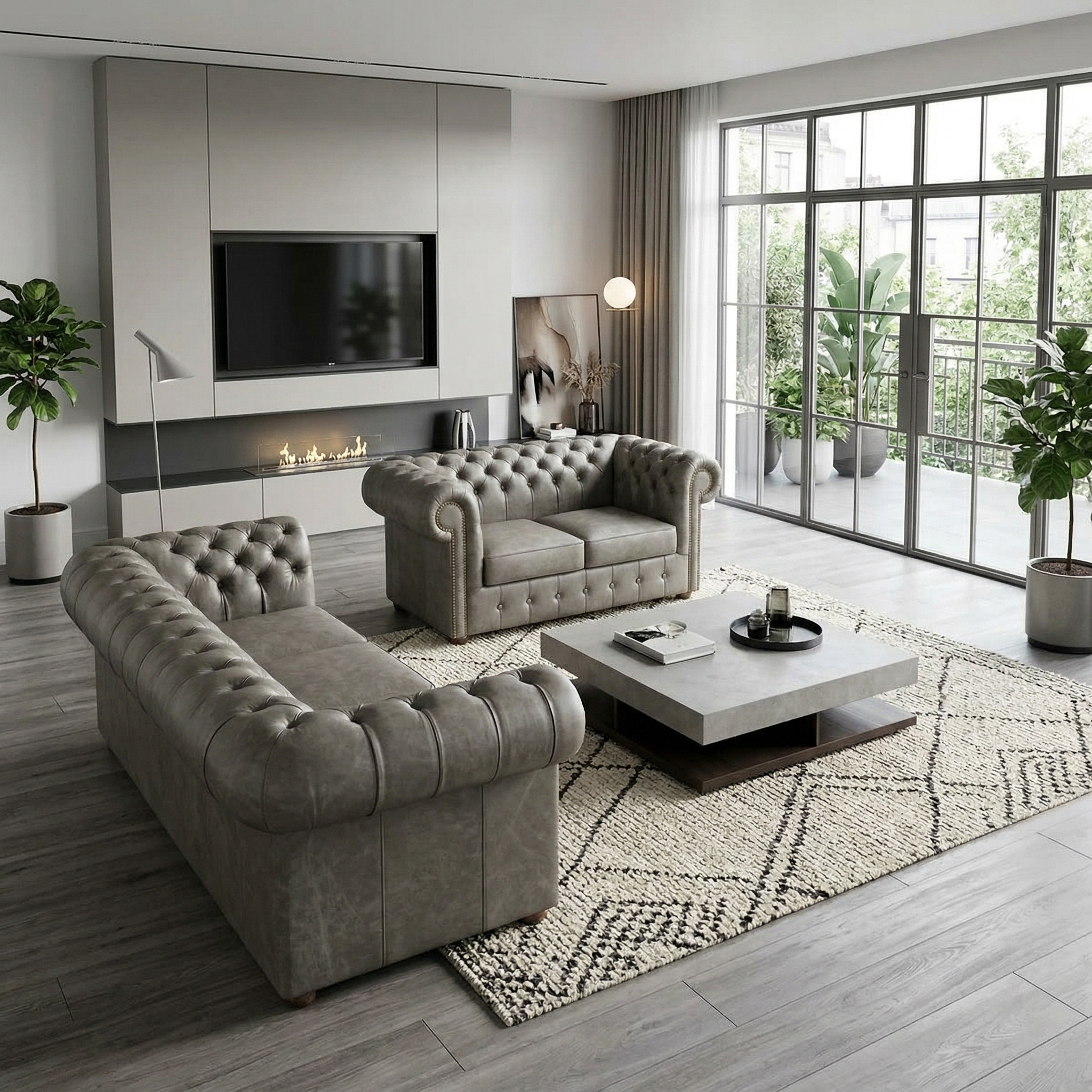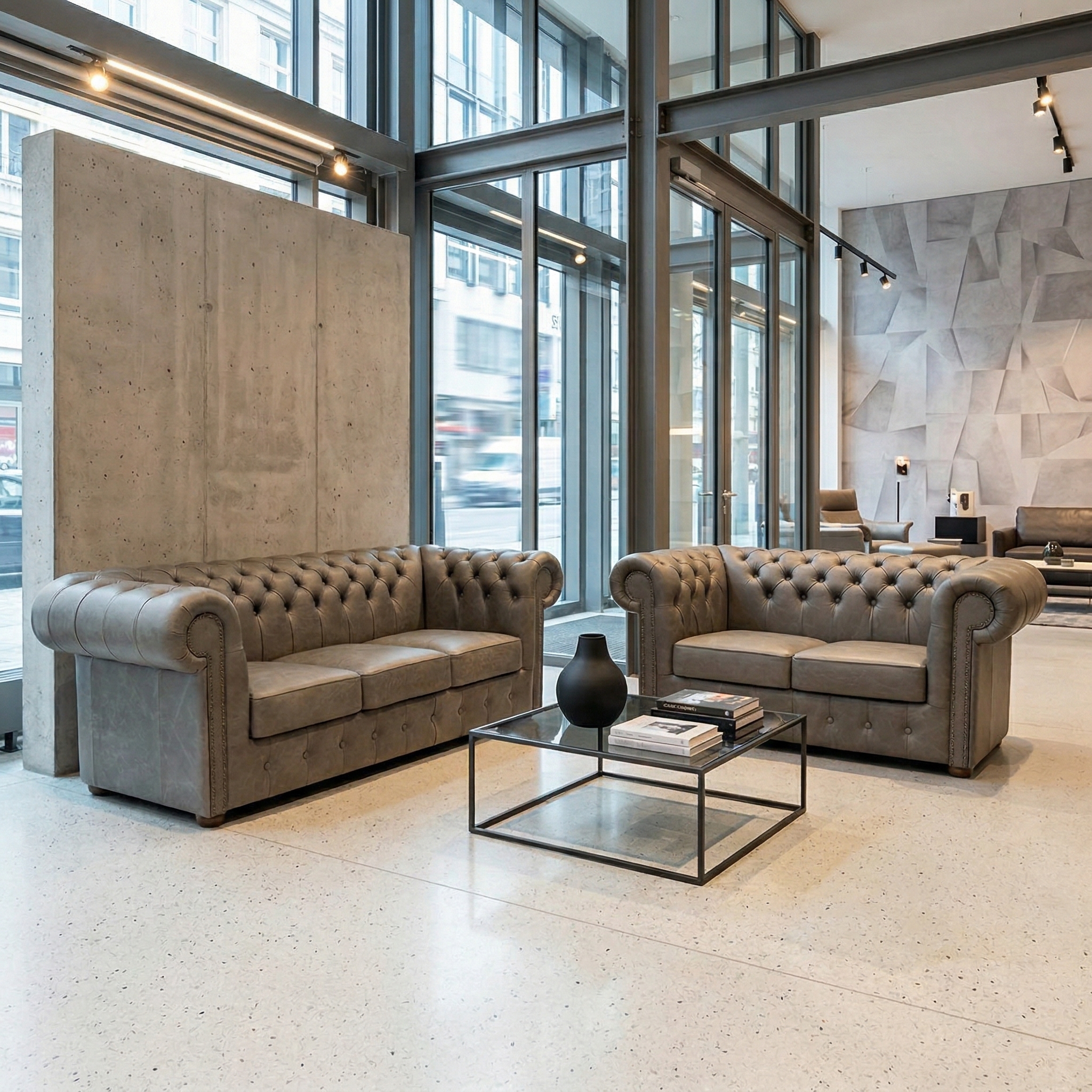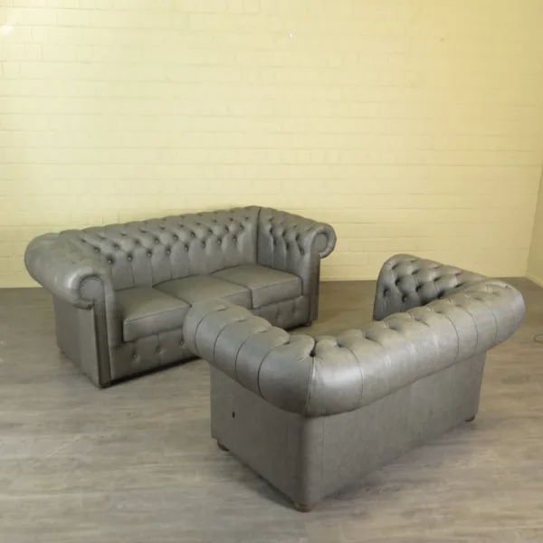 Chesterfield Couchgarnitur Grau 3-2 Leder