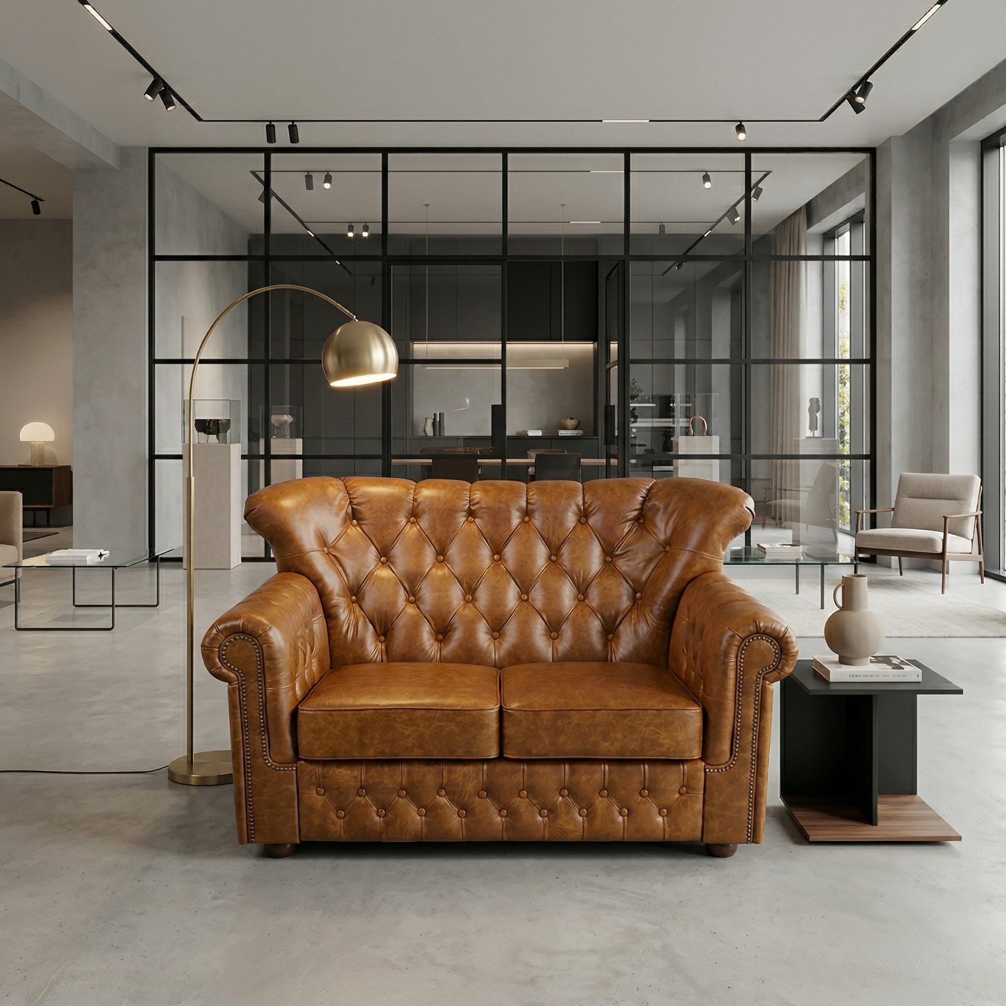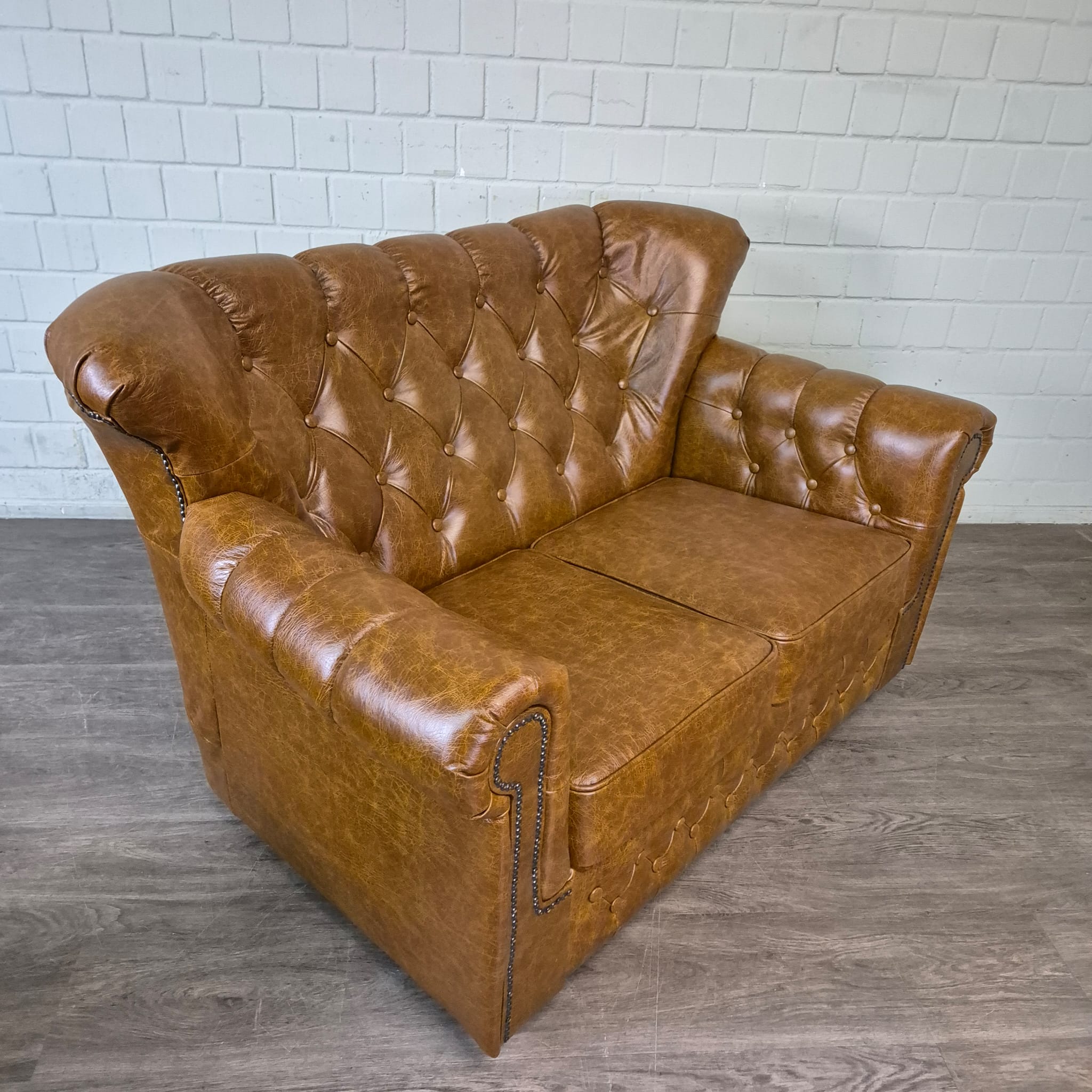 Stilvolle 2-Sitzer Chesterfield Couch in Leder bezogen. Farbton Camel.   Maße:   Länge 1,53 m Breite 0,97 m Höhe 0,90 m Sitzhöhe 0,44 m Sitztiefe 0,60 m