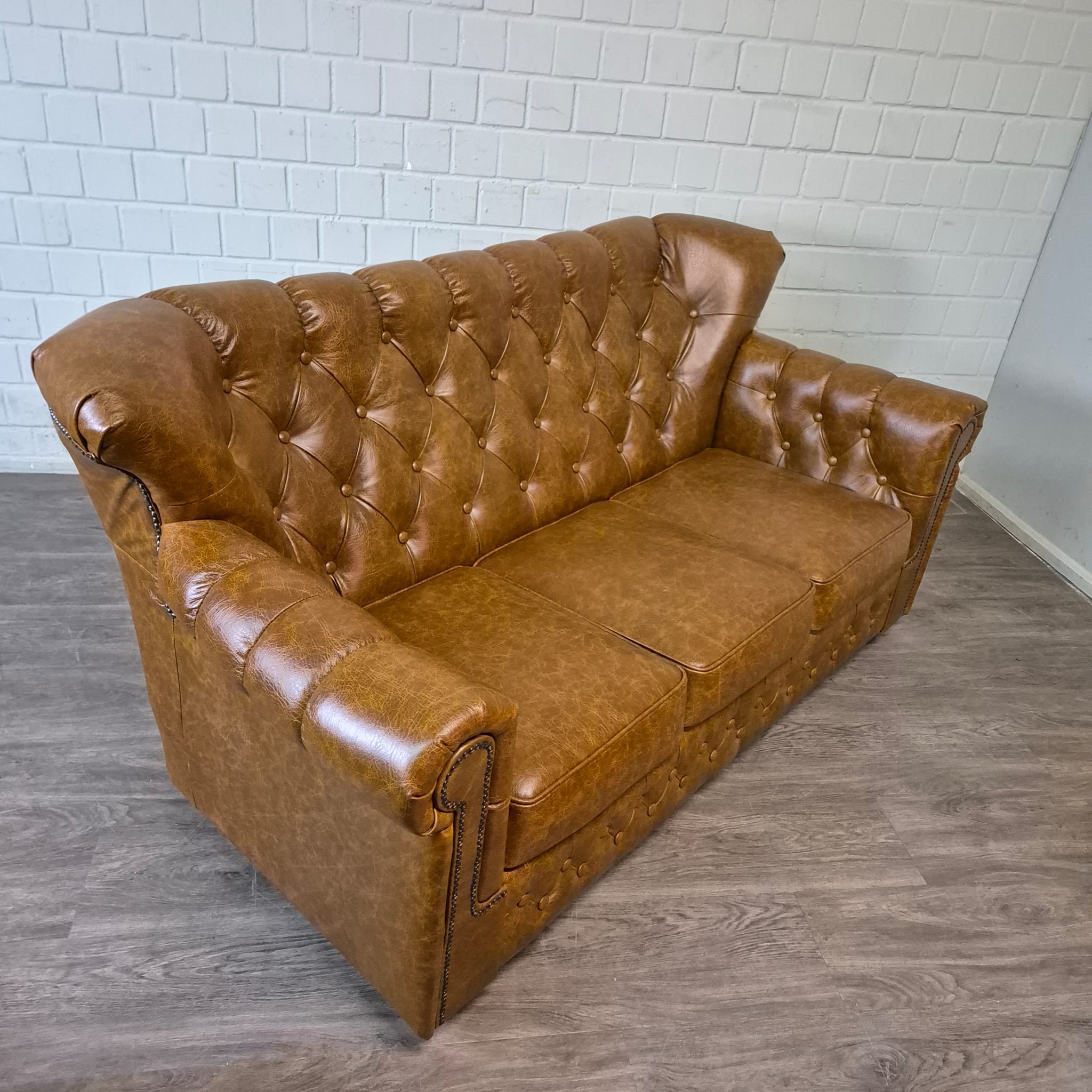 Stilvolle 3-Sitzer Chesterfield Couch in Leder bezogen. Farbton Camel.   Maße:   Länge 1,95 m Breite 0,97 m Höhe 0,90 m Sitzhöhe 0,44 m Sitztiefe 0,60 m