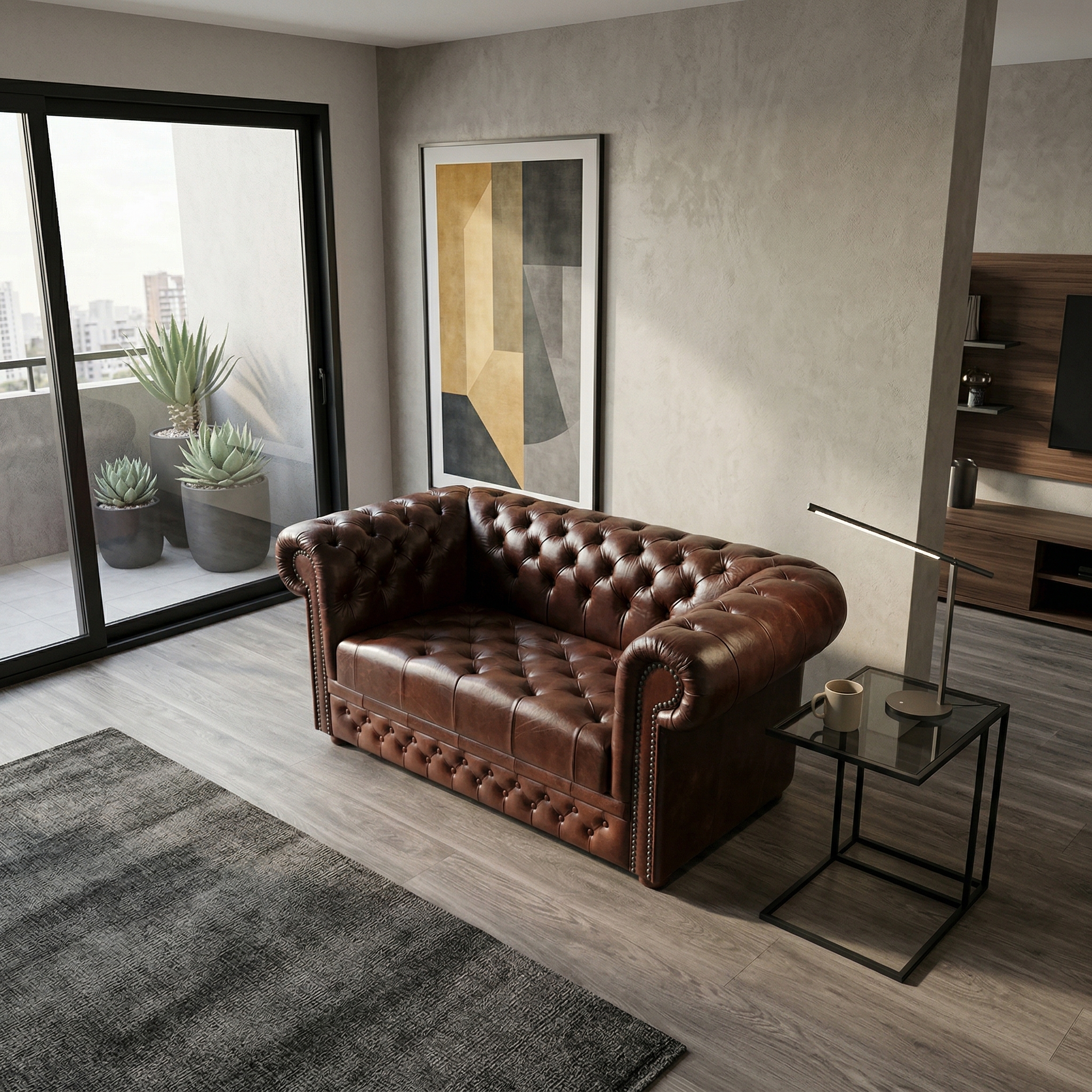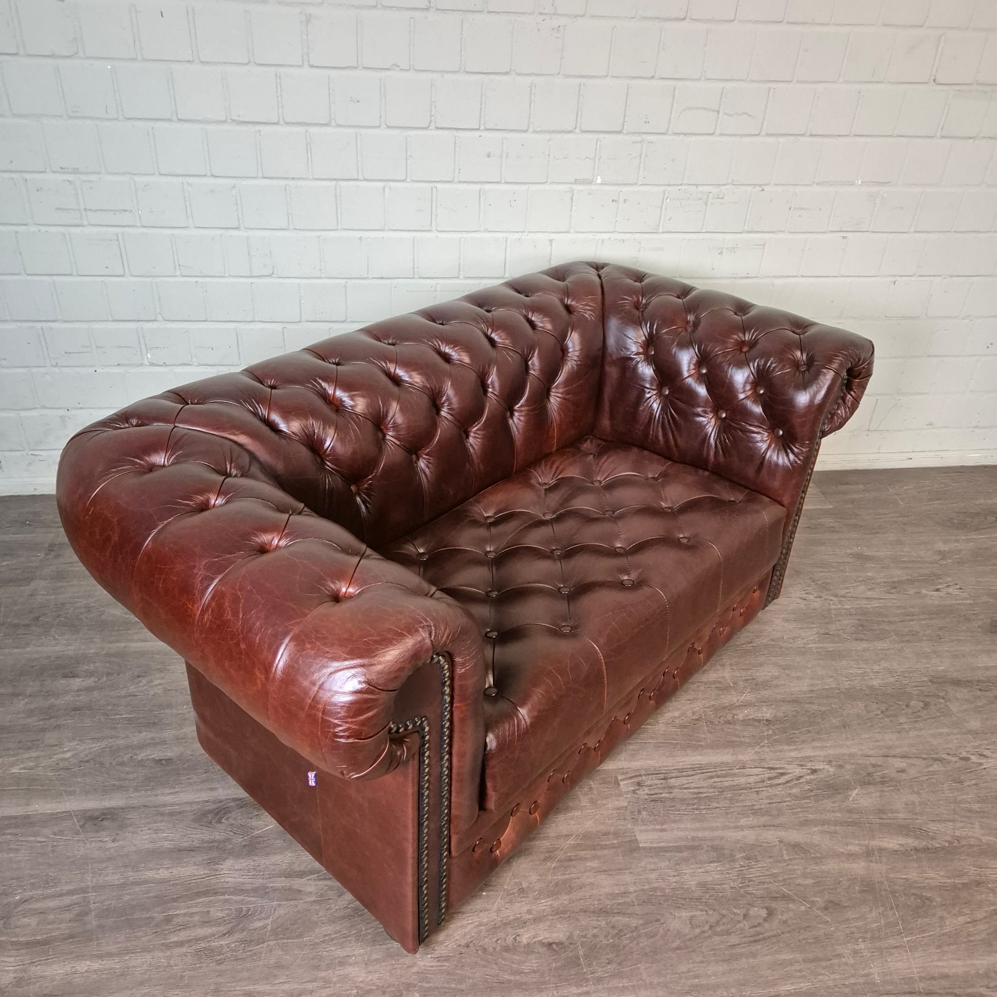 Stilvolle 2-Sitzer Chesterfield Couch in Leder bezogen. Farbton Kastanienbraun.   Maße:   Länge 1,65 m Breite 0,88 m Höhe 0,78 m Sitzhöhe 0,45 m Sitztiefe 0,54 m