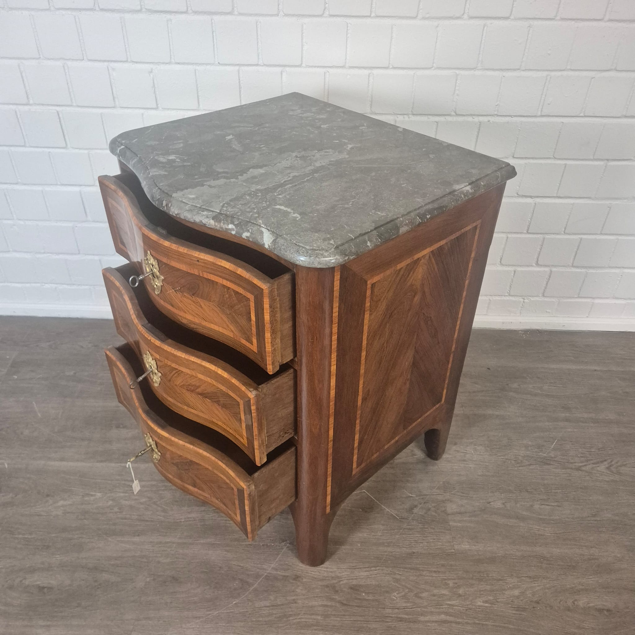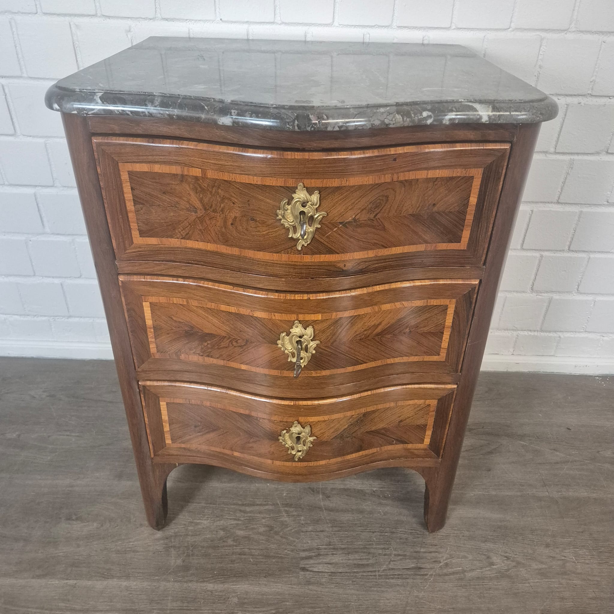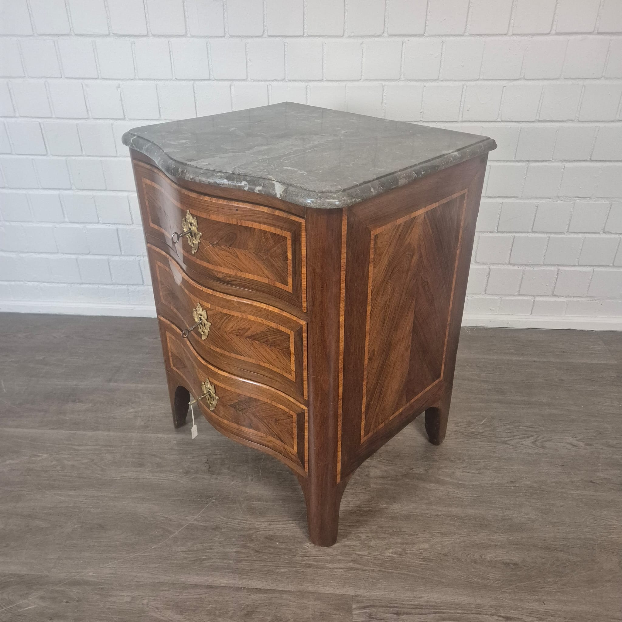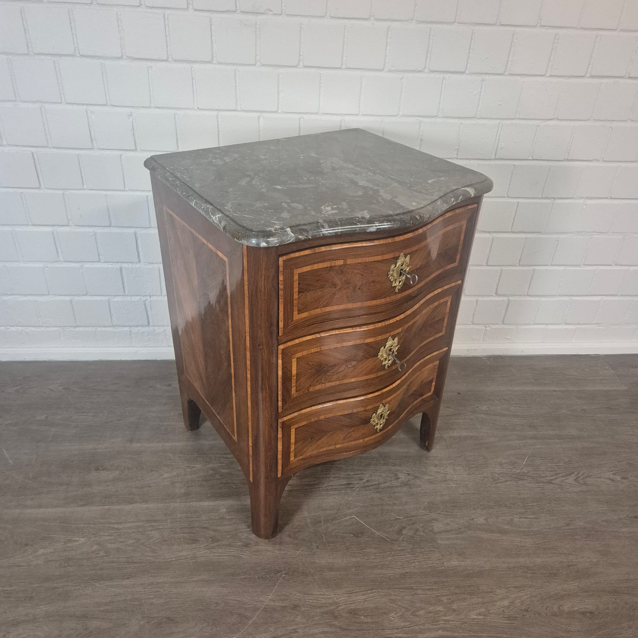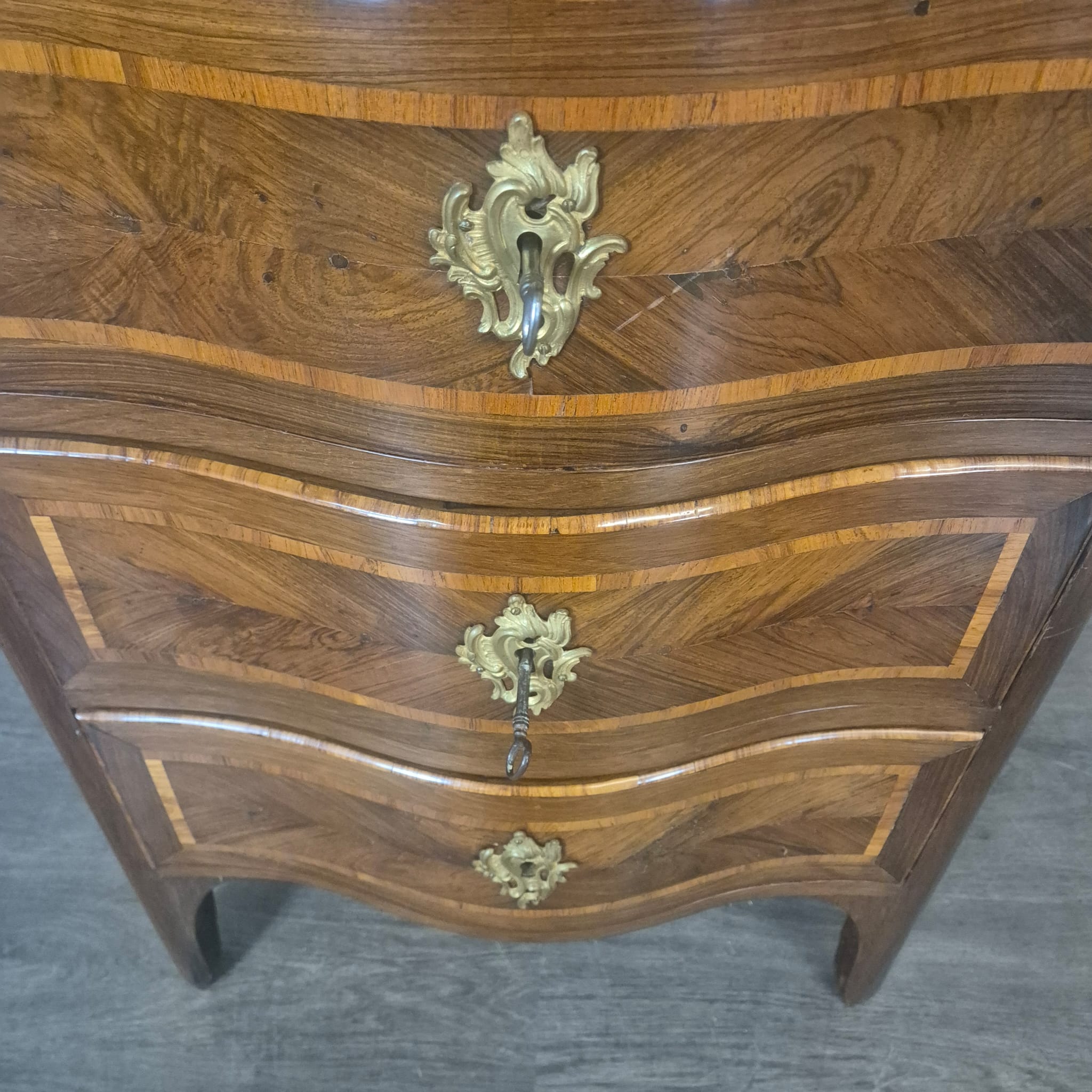Comò Barocco restaurato, impiallacciato in noce (laccato), del 1780 circa. Il mobile si trova in buone condizioni e presenta solo lievi segni di usura.