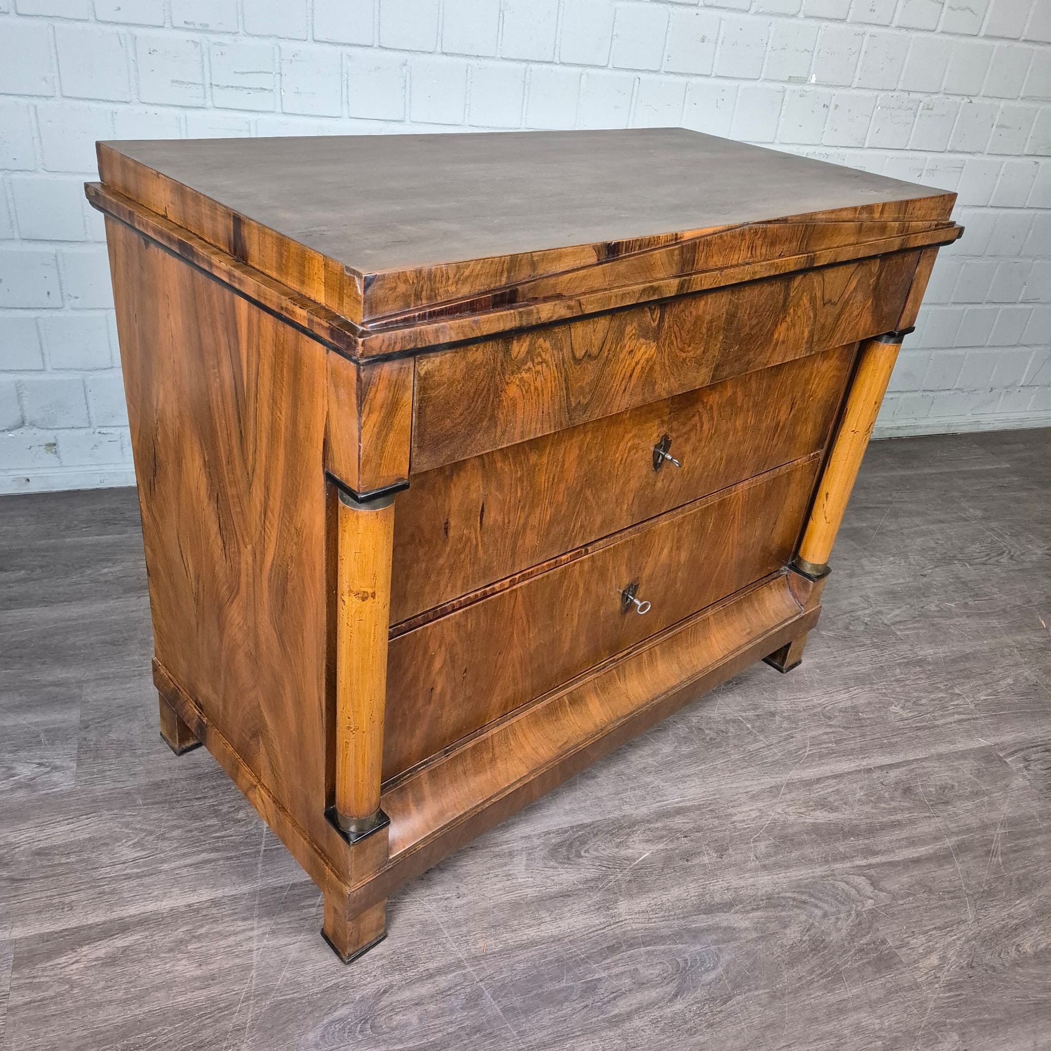 Comò Biedermeier restaurato in noce intarsiato risalente circa al 1800. L’armadio è in ottime condizioni e presenta solo minimi segni di usura. 3 cassetti, ferramenta originale, impiallacciatura in noce, pannello posteriore originale Biedermeier circa 1830. Dimensioni: larghezza 1,05 m, altezza 0,87 m, profondità 0,54 m.