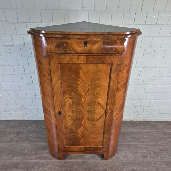 Restaurierter Biedermeier Eckschrank in Mahagoni furniert und lackiert von ca. 1810. Der Schrank befindet sich in einem guten Zustand und weist nur leichte Gebrauchsspuren auf.    3 Regalboden 1 Schublade Mahagoni Furnier Biedermeier ca. 1810   Maße:   Breite 0,88 m Höhe 1,49 m Tiefe 0,53 m Schenkellänge 0,62 m