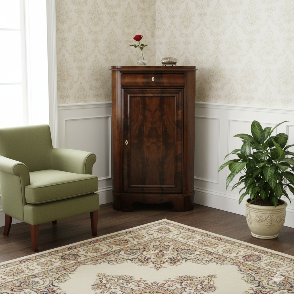 Restaurierter Biedermeier Eckschrank in Mahagoni (gewachst) furniert von ca. 1850. Der Schrank befindet sich in einem sehr guten Zustand und weist nur minimale Gebrauchsspuren auf.  • 2 Regalboden • 1 Schublade • Mahagoni Furnier • Biedermeier ca. 1850 Maße: Breite 0,92 m Höhe 1,41 m Tiefe 0,57 m – 0,63 m