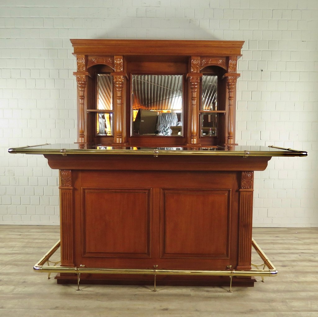 Die Theke Modell Empire aus Mahagoni präsentiert sich mit aufwendigen Schnitzereien und Ornamenten an der Barfront, sowie an dem mit Spiegeln versehenen Rückwandbuffet.