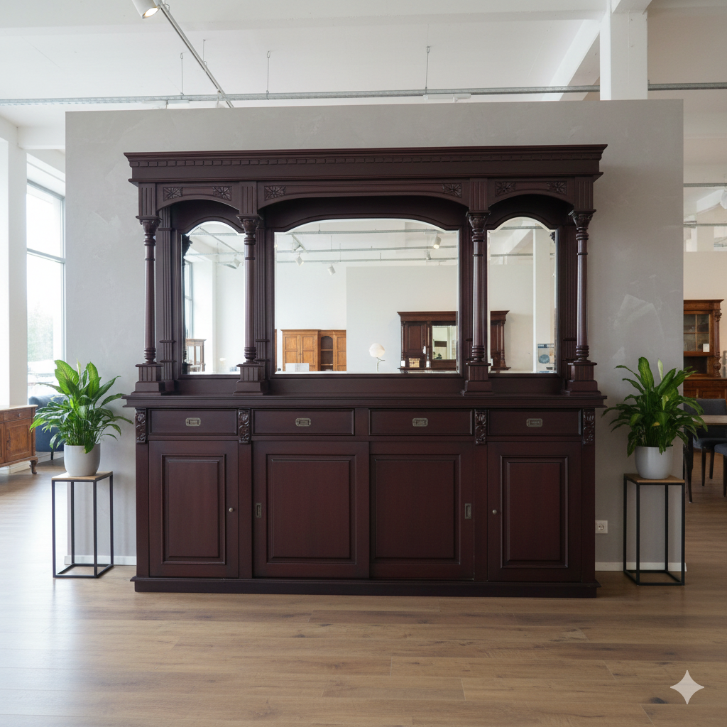 3.108,40€ Preis ohne SteuerDas Rückwandbuffet der englischen Bar aus massiv Mahagoni präsentiert sich mit aufwendigen Schnitzereien, Ornamenten und Spiegeln. • massiv Mahagoni • Farbton: Mahagoni • 4 Schubladen • 3 Regalboden • Schiebetüren • Spiegel • zerlegbar (2-teilig) Maße: Breite 2,60 m Höhe 2,40 m Tiefe 0,50 m