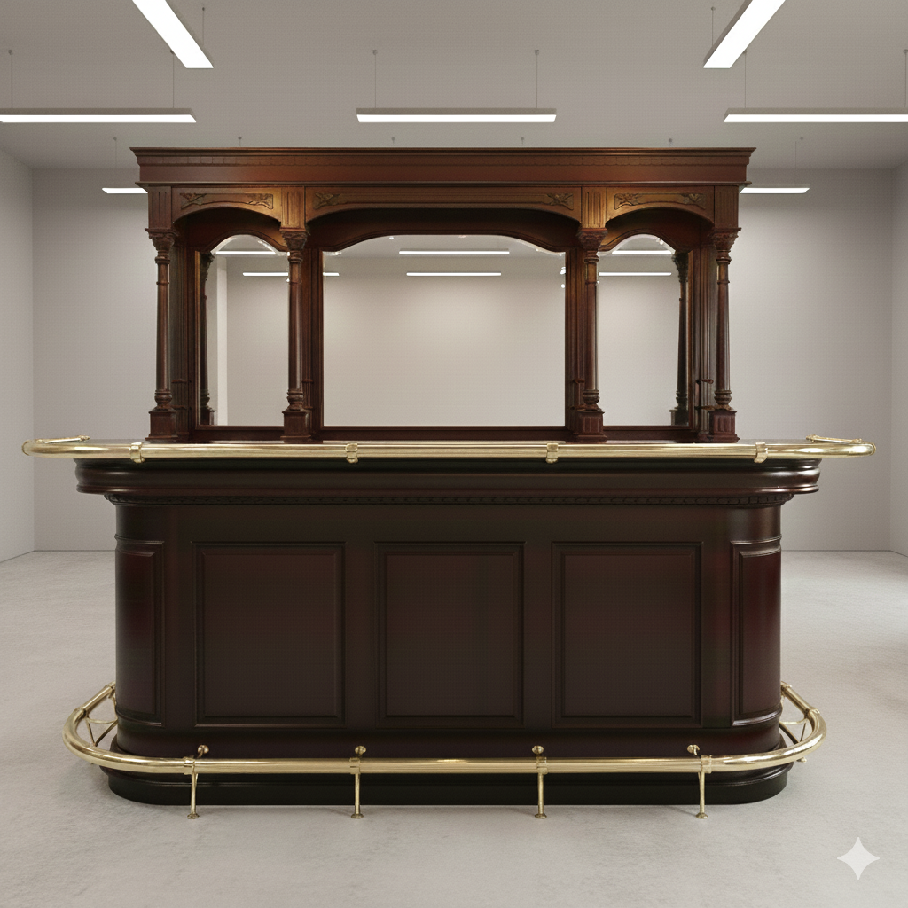 Die englische Bar aus massiv Mahagoni präsentiert sich mit aufwendigen Schnitzereien und Ornamenten an der Barfront, sowie an dem mit Spiegeln versehenen Rückwandbuffet.