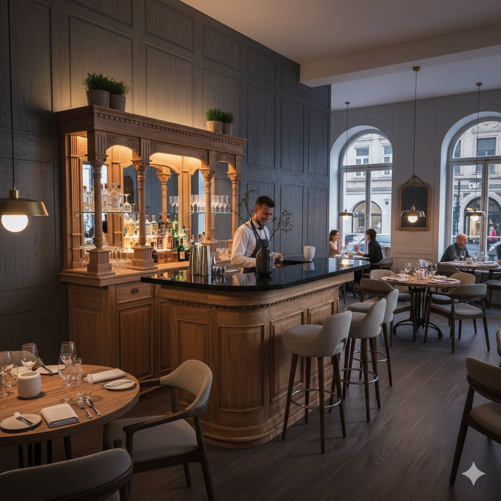 Die englische Bar aus massiv Teakholz präsentiert sich mit aufwendigen Schnitzereien und Ornamenten an der Barfront, sowie an dem mit Spiegeln versehenen Rückwandbuffet.
