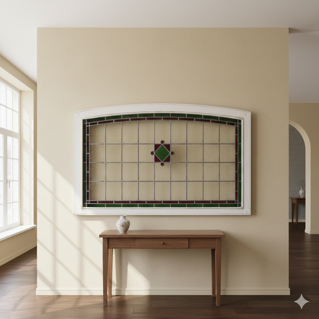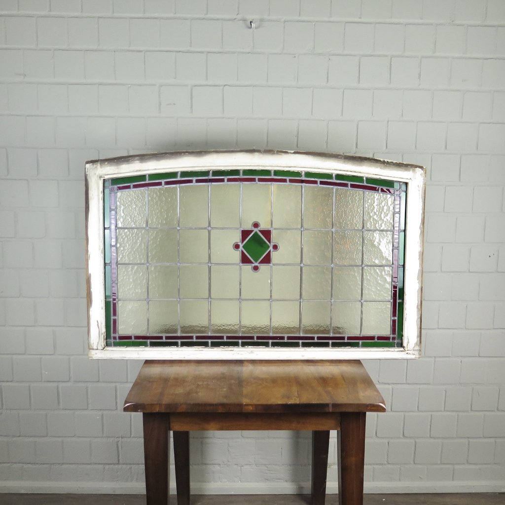 Aufwendig gestaltetes Fenster mit Bleiverglasung von ca. 1910. Die Bleiverglasung befindet sich in einem guten Zustand, allerdings weist sie ein paar kleine Risse auf. Maße: Breite 1,20 m Höhe 0,76 mTiefe 0,05 m