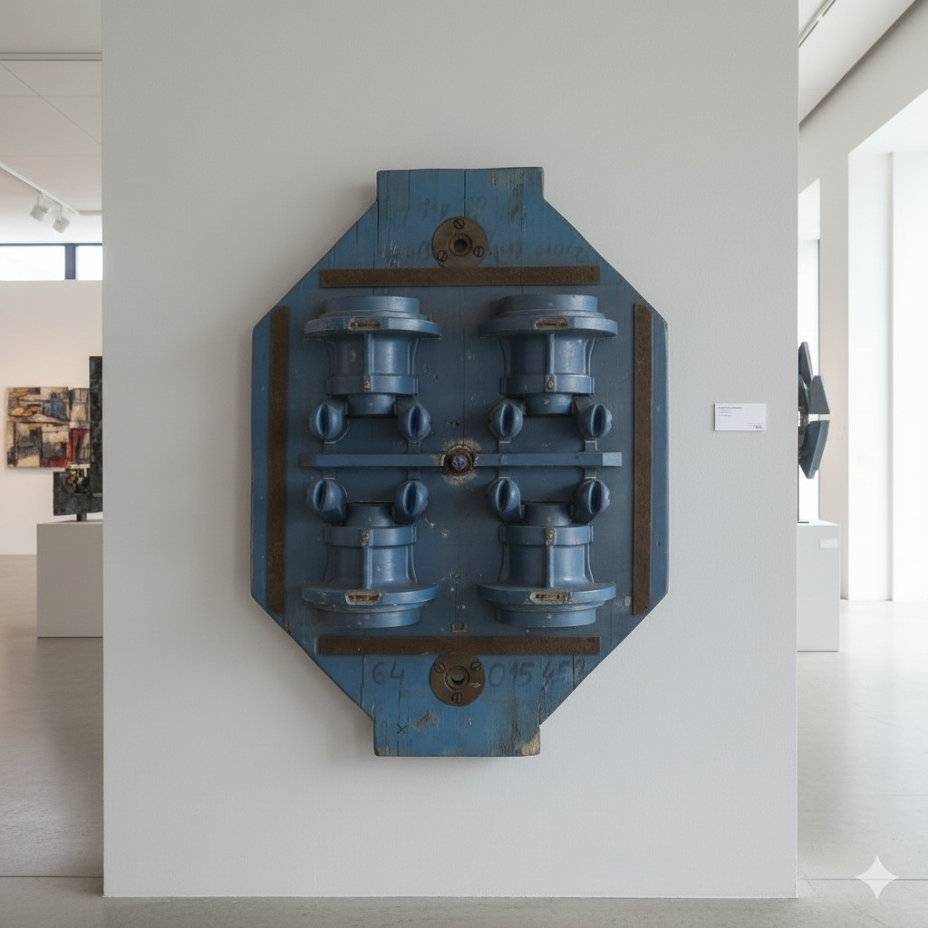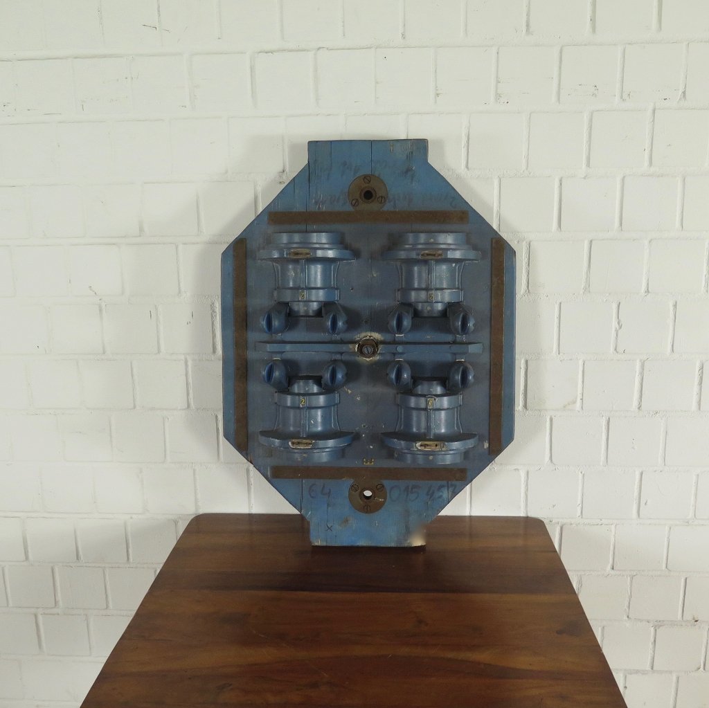 Im Originalzustand stehende Gussform aus mit Kunststoff bezogenen Massivholz von ca. 1950. Die aus der Metallindustrie stammende Form befindet sich in einem guten Zustand und weist nur normale Gebrauchsspuren auf. Sie ist frei von Wurmbefall. Maße: Breite 0,60 m Höhe 0,88 m