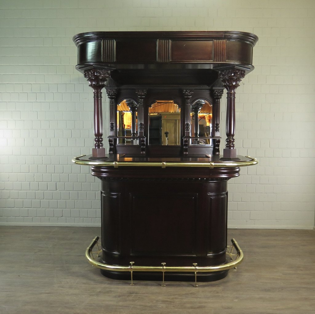 4.789,08€ Preis ohne SteuerDie Theke Modell Home Bar aus Massivholz beeindruckt durch ihr imposantes Erscheinungsbild, sowie dem stilvollen mit Spiegeln und Säulen versehenen Rückwandbuffet. Zerlegbar (4-teilig). Massiv Mahagoni Farbton: Mahagoni Rückwandbuffet: 3 Schubladen 1 Regalboden 2 Schiebetüren Spiegel Tresen: Hand- und Fußlauf aus Messing Maße: Breite 1,70 m Höhe 2,26 m Tiefe 2,05 m