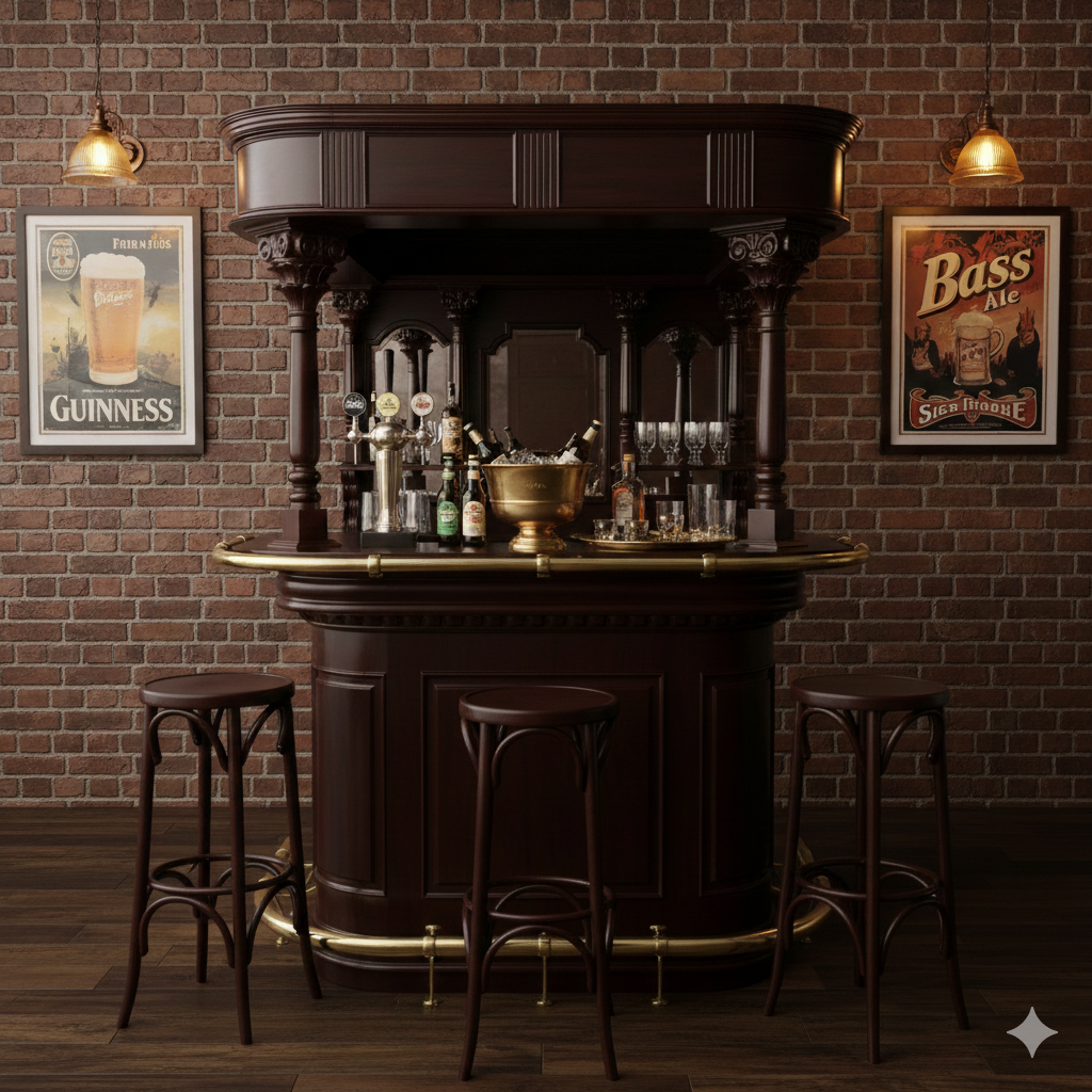Die Theke Modell Home Bar aus Massivholz beeindruckt durch ihr imposantes Erscheinungsbild, sowie dem stilvollen mit Spiegeln und Säulen versehenen Rückwandbuffet. Zerlegbar (4-teilig).