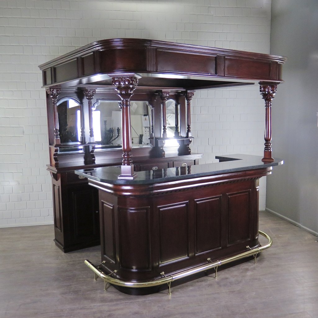 Die Theke Modell Home Bar aus Massivholz beeindruckt durch ihr imposantes Erscheinungsbild, sowie dem stilvollen mit Spiegeln und Säulen versehenen Rückwandbuffet. Zerlegbar (8-teilig).