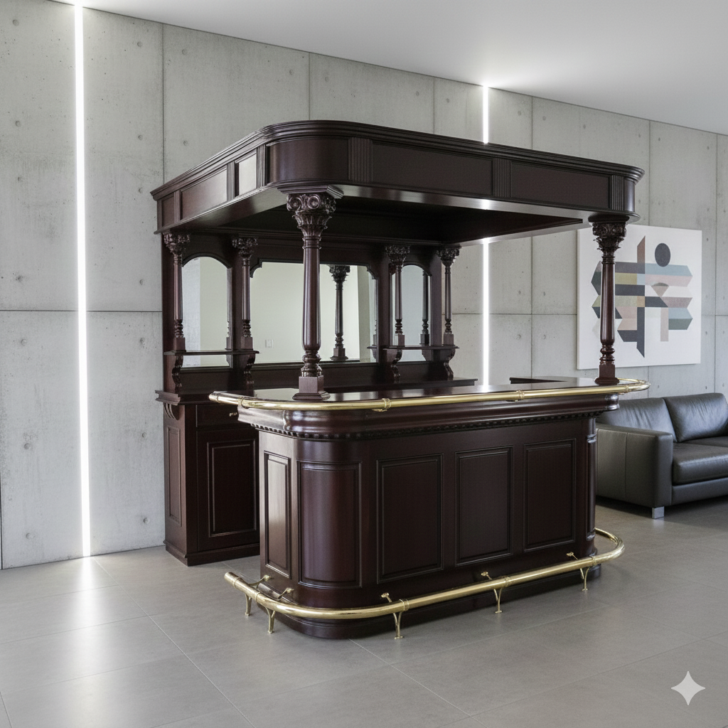 Die Theke Modell Home Bar aus Massivholz beeindruckt durch ihr imposantes Erscheinungsbild, sowie dem stilvollen mit Spiegeln und Säulen versehenen Rückwandbuffet. Zerlegbar (8-teilig).