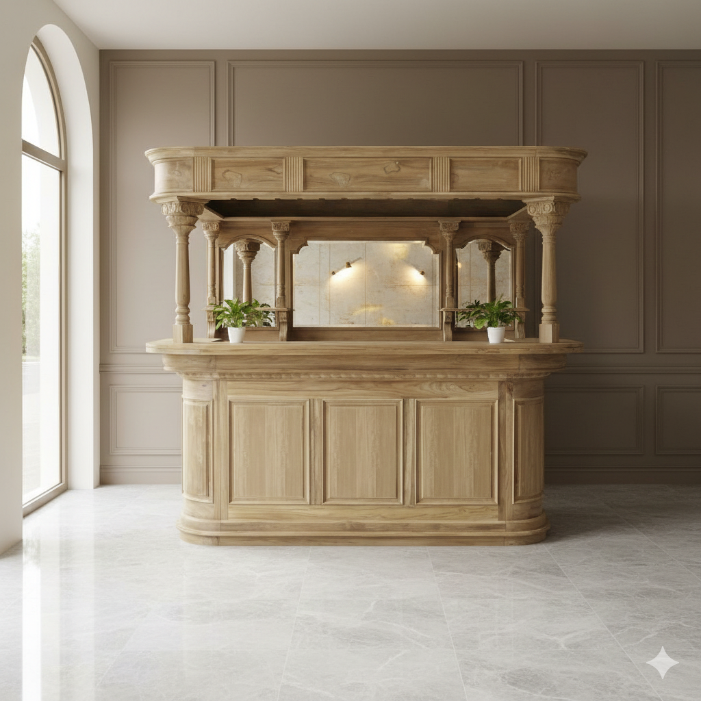 Diese stilvoll gestaltete Hausbar aus massiv Teakholz erhält ihre besondere Wirkung durch natürliche Unregelmäßigkeiten im Holz. Diese entstehen durch das verwendete Edelholz mit seinen verschiedenen Farben und Strukturen, welche diesem Stück einen eigentümlichen Charakter verleihen und es zu einem Unikat machen. Maserung und Farbton des Holzes tragen sehr zum optischen Wert dieser Möbel bei, die sowohl dekorative Möglichkeiten als auch genügend Stauraum bieten. Die Kombination von nostalgischer Optik und moderner Funktionalität ist für alle Gastronomieeinrichtungen sowie vielen weiteren Einsatzgebieten geeignet. Die Bar wird komplett fertig montiert geliefert und ist somit sofort einsatzbereit.