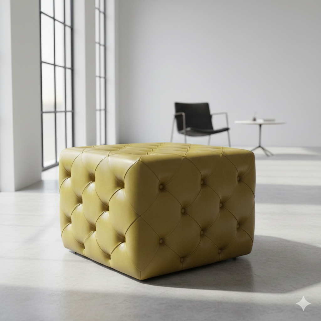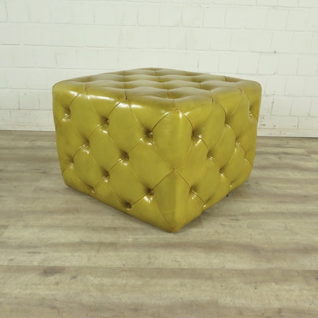 Stilvoll gestalteter Chesterfield Hocker aus Leder in der Farbe Lime. Maße: Breite 0,64 mHöhe 0,47 mTiefe 0,64 m