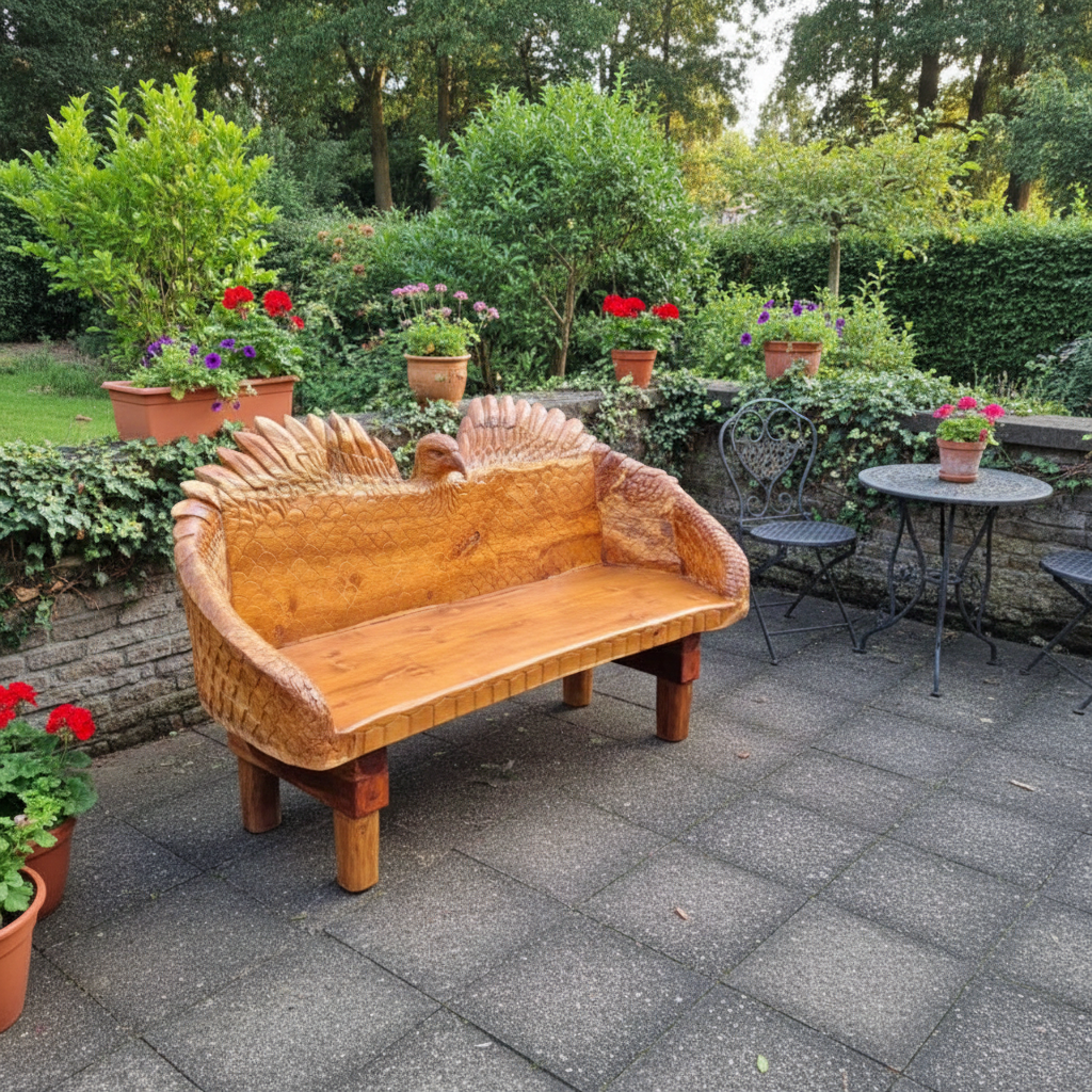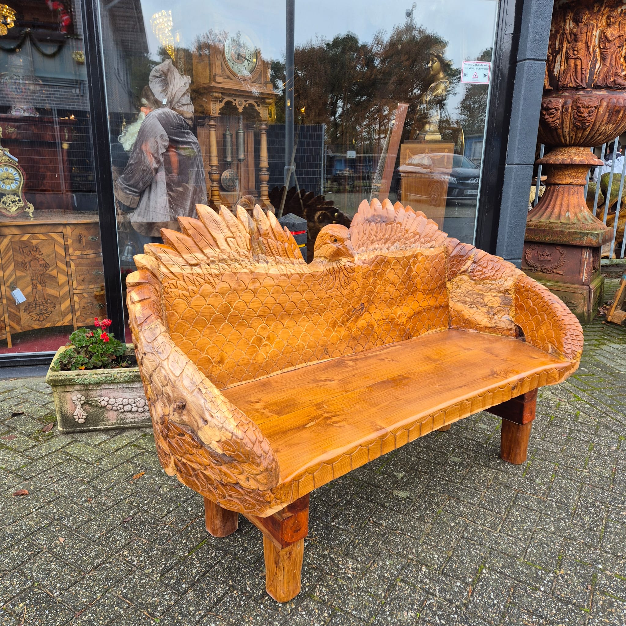 Originell gestaltete Bank in Form eines Adlers hergestellt aus massiv Teakholz. Handgeschnitzt.   Maße:   Länge 1,90 m Breite 0,80 m Höhe 1,13 m Sitzhöhe 0,50 m Sitztiefe 0,56 m