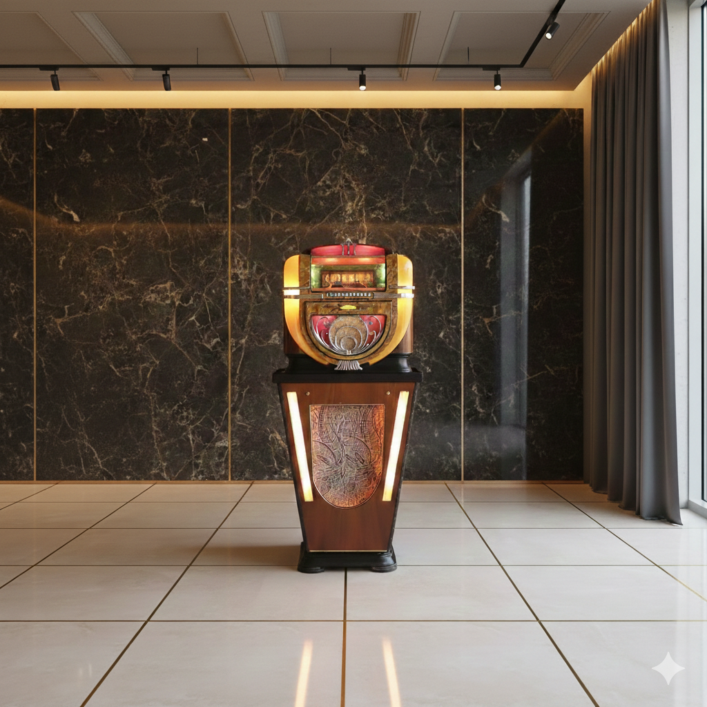 7.999,00€ Preis ohne SteuerDiese hochwertige Reproduktion der Wurlitzer Model 71-Theken-Jukebox von 1942, die Antique Apparatus CD-91, wurde mit CD-Technologie aktualisiert. Die Jukebox wurde 1991 aus Harthölzern und speziell gebogenem Sperrholz gebaut, mit Walnuss- und afrikanischen Holzfurnieren überzogen und ist genauso hochwertig wie das Original. Die geschwungenen goldgelben Kunststoffteile sind mit verchromten Druckgussteilen versehen und leuchten. Antique Apparatus (später … Weiterlesen