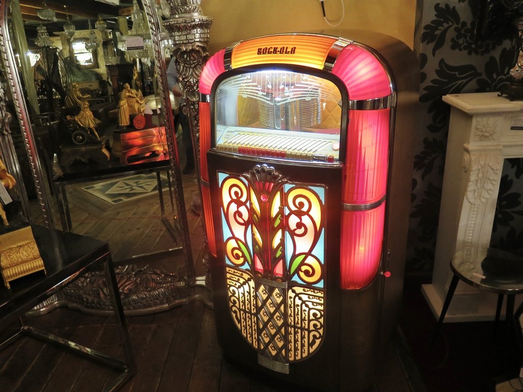 Im Originalzustand stehende Jukebox von Rock-Ola. Das von 1946 produzierte Modell 1422 ist ausgestattet mit einem sichtbaren Plattenwechsler für 20 Wahlmöglichkeiten auf 78er Shellackplatten. Das Modell 1422 ist das erste Nachkriegsmodell in neuem Design. Sie wurde ausgestattet mit einem aufwendig gestalteten Holzgehäuse und mehrfarbig beleuchtete Plastiks mit drehbaren Farbzylindern. Ein großer Art-Deco Chrom Lautsprechergrill und … Weiterlesen