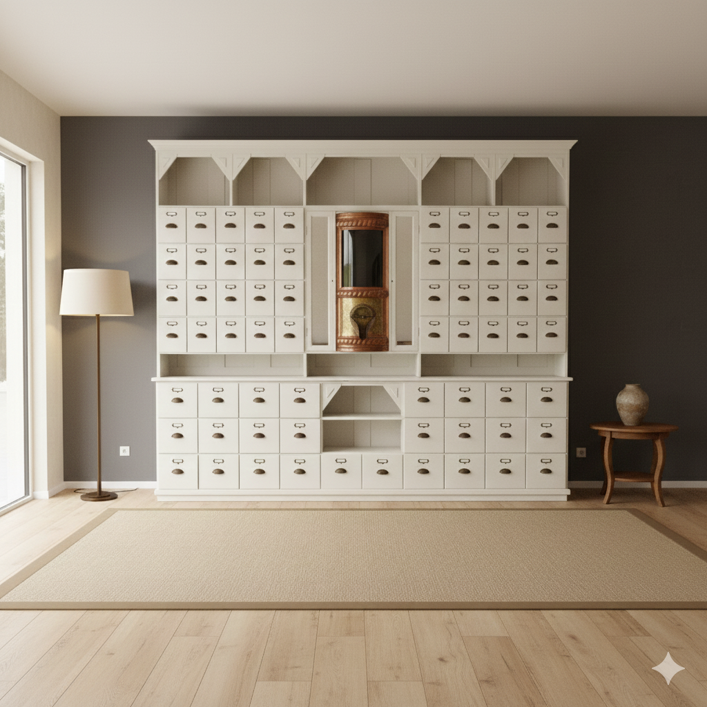Restaurierter Jugendstil Kaffeeschrank aus Massivholz (lackiert) von ca. 1910. Der Schrank befindet sich in einem guten Zustand und weist nur leichte Gebrauchsspuren auf. Er ist frei von Wurmbefall. Zerlegbar (2-teilig). • 66 Schubladen • 10 offene Fächer • Kaffeeschütte • Massivholz • Jugendstil ca.1910 Maße: Breite 3,34 m Höhe 2,90 m Tiefe 0,40 m