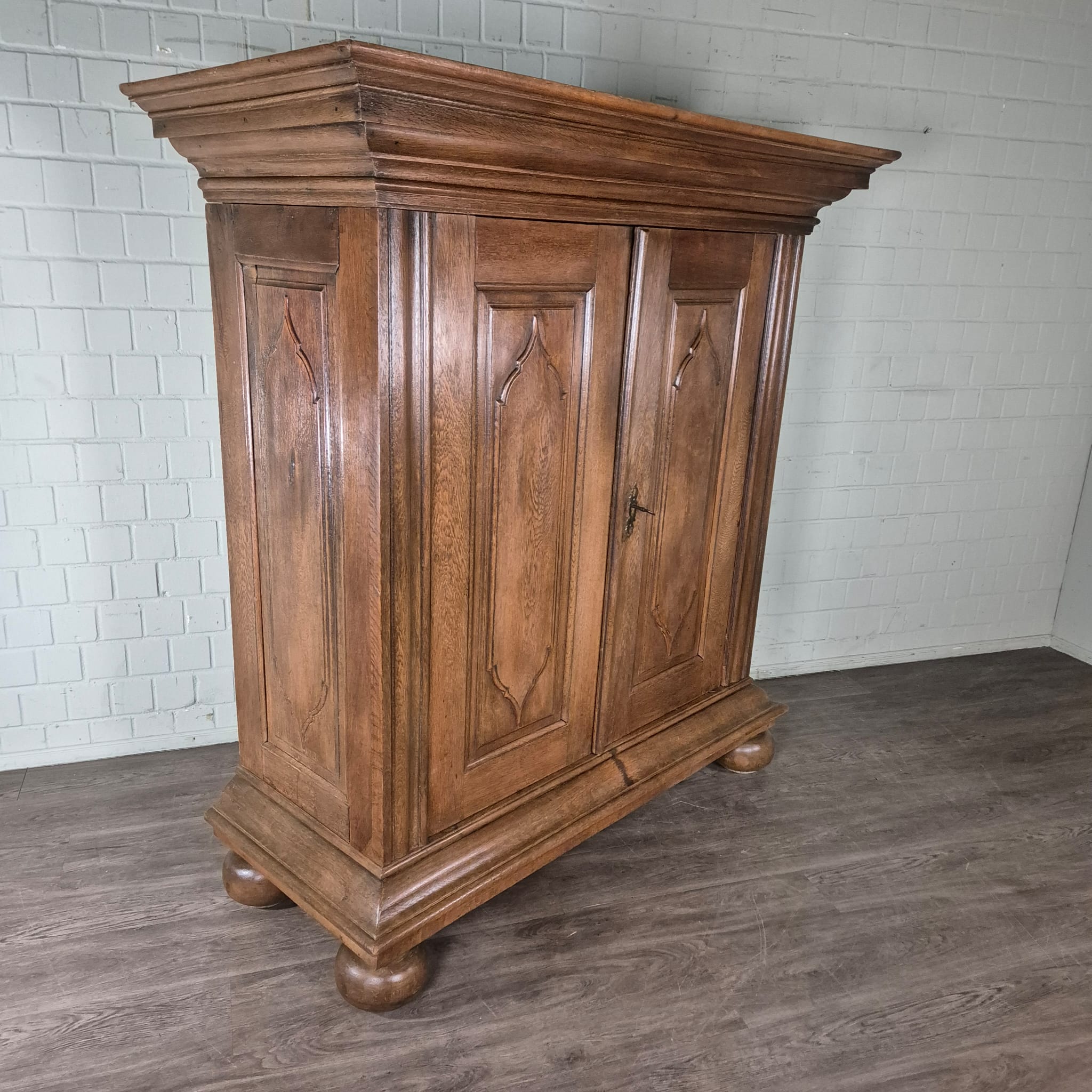 Restaurierter Barock Kleiderschrank aus massiv Eiche (gewachst) von ca. 1780. Der mit erneuerter Rückwand versehene Schrank befindet sich in einem sehr guten Zustand und weist nur minimale Gebrauchsspuren auf. Zerlegbar (7-teilig).