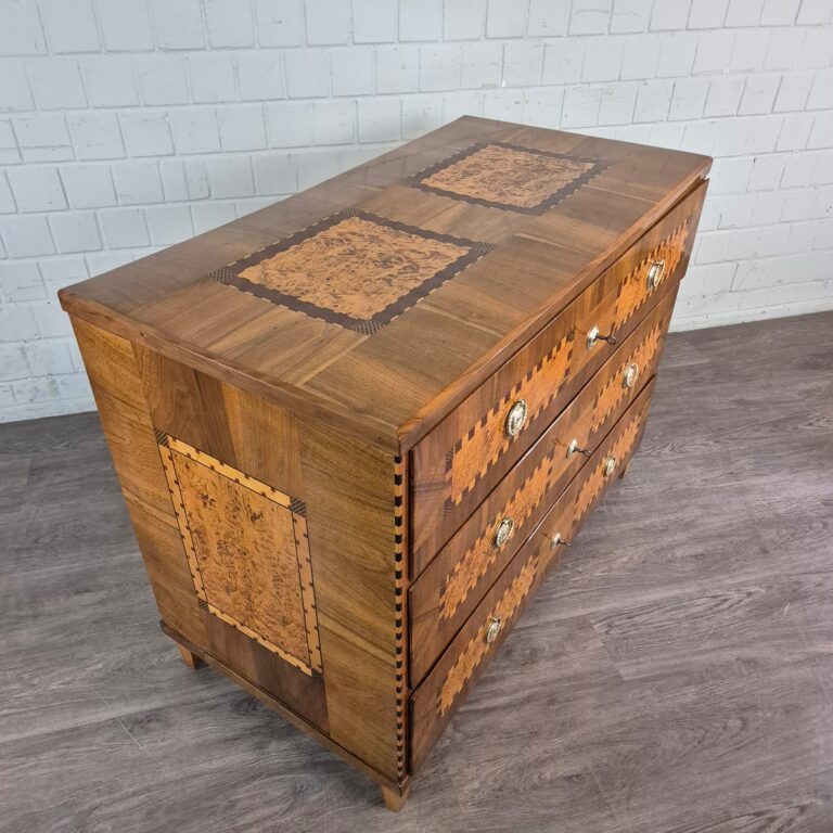 Restaurierte Empire Kommode in Nussbaum und Wurzelholz furniert und von Grund auf Schellack poliert von ca. 1800. Die mit Bandintarsien versehene Kommode befindet sich in einem sehr guten Zustand und weist nur minimale Gebrauchsspuren auf.   3 Schubladen Nussbaum und Wurzelholz Furnier  Intarsien Empire ca. 1800   Maße:   Breite 1,24 m Höhe 0,93 m … Weiterlesen