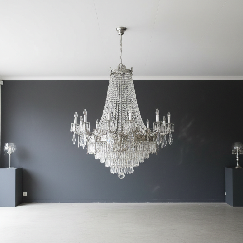 Stilvoller Kronleuchter aus Glas und Metall (Chrom) ausgestattet mit 16 Lampen. Maße: Breite 0,95 m Höhe 1,00 mTiefe 0,80 m Bei dem angegeben Preis handelt es sich um den Abholpreis. Der Versand dieses Artikels ist nach vorheriger Besichtigung und gegen Übernahme der Versandkosten möglich.