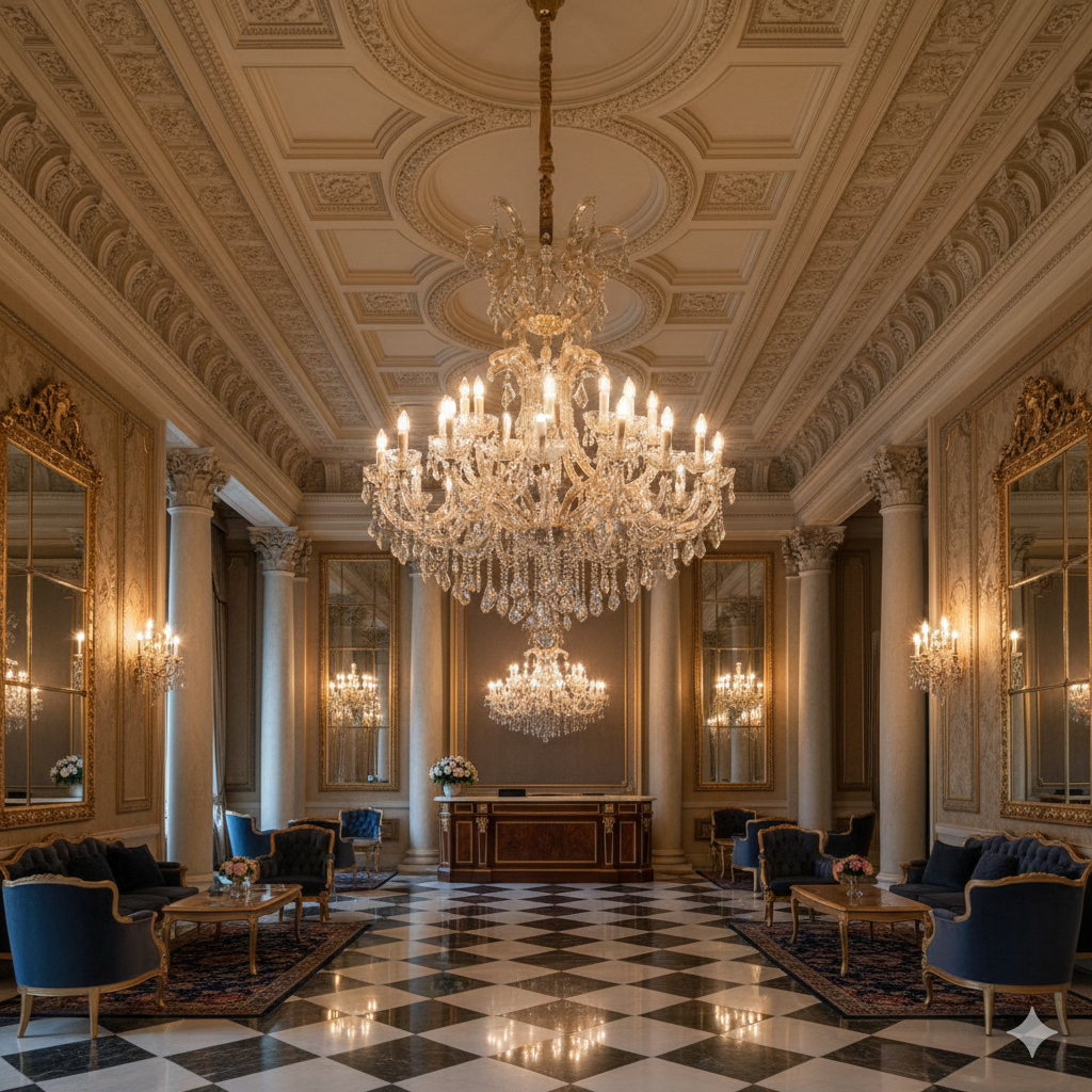 Stilvoller goldener Kronleuchter aus Kristallglas. Maße: Durchmesser 1,20 mHöhe 1,50 m – 2,00 m