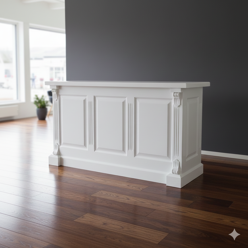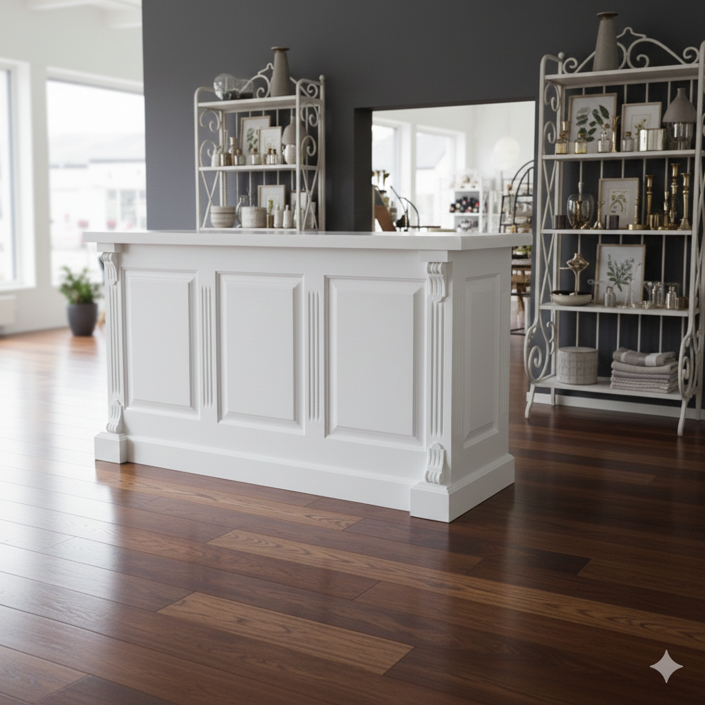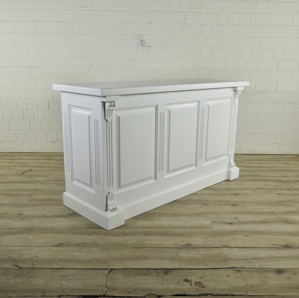 Der Verkaufstresen Modell Anke aus massiv Kiefer besticht durch seine stilvolle Eleganz und der aufwendigen Verarbeitung. Die Kombination von nostalgischer Optik und moderner Funktionalität ist für alle Ladeneinrichtungen sowie vielen weiteren Einsatzgebieten geeignet. Der Tresen wird komplett fertig montiert geliefert und ist somit sofort einsatzbereit. • Massivholz• Farbton: Weiß Ausstattung: • 4 Schubladen auf Rollschienen• … Weiterlesen