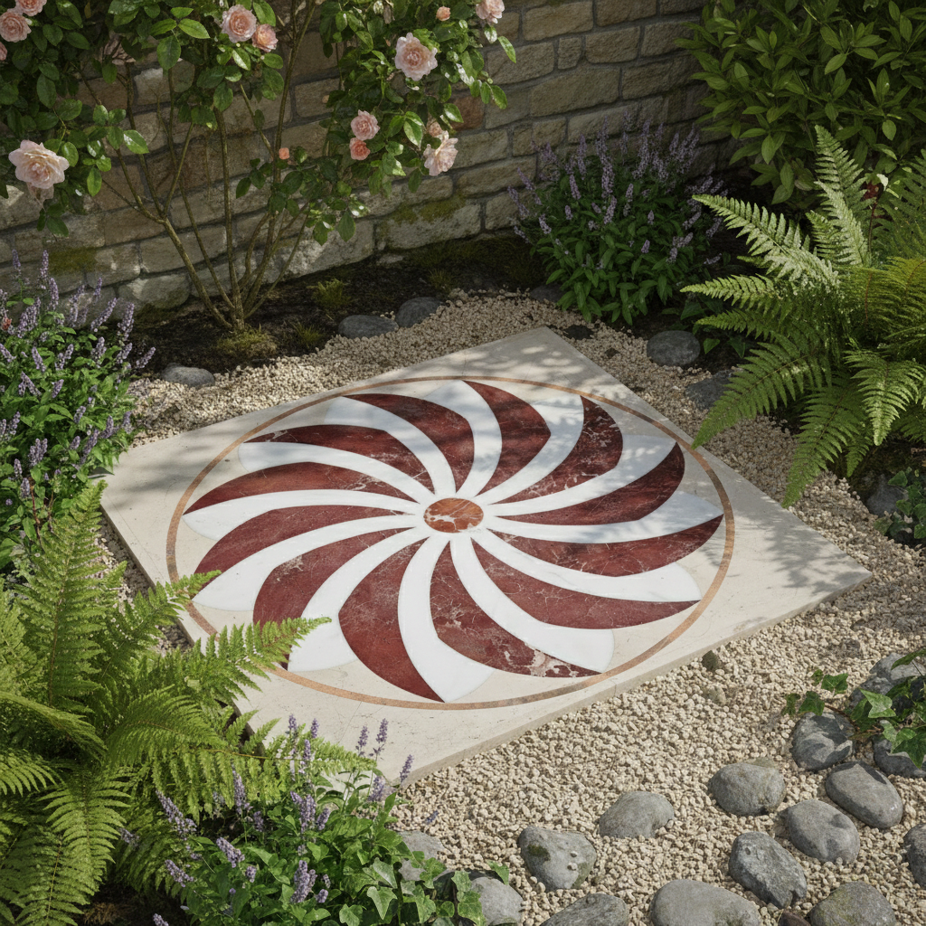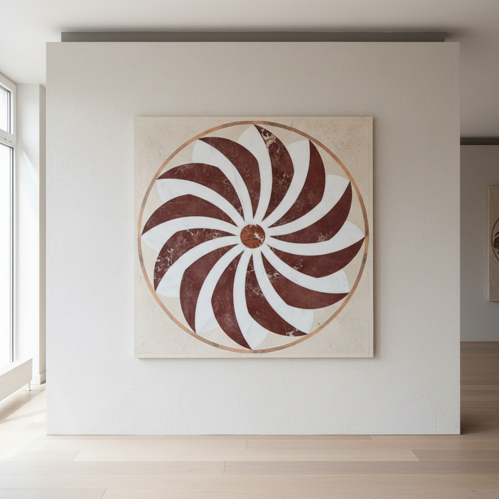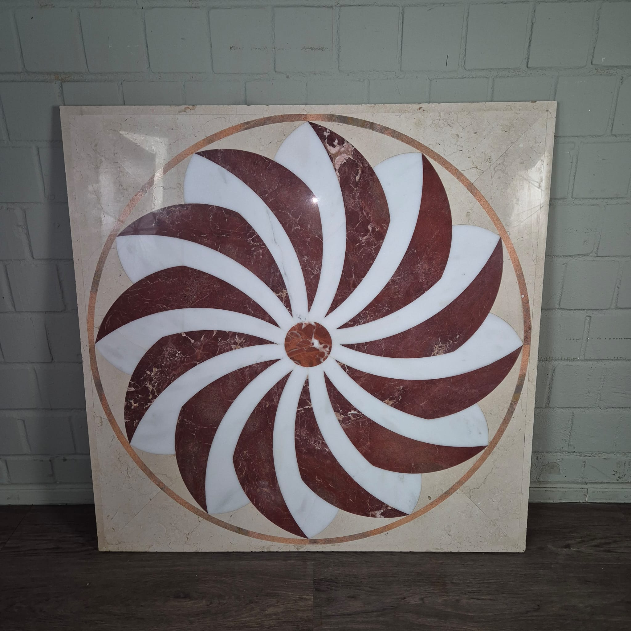 Marmorplatte mit farblich abgesetzten Rahmen und Intarsien. Hochwertig verarbeitet, hervorragende Qualität. Als Tischplatte oder Bodenplatte für Haus und Garten geeignet. Maße: Länge 1,00 mBreite 1,00 mStärke 2 cm