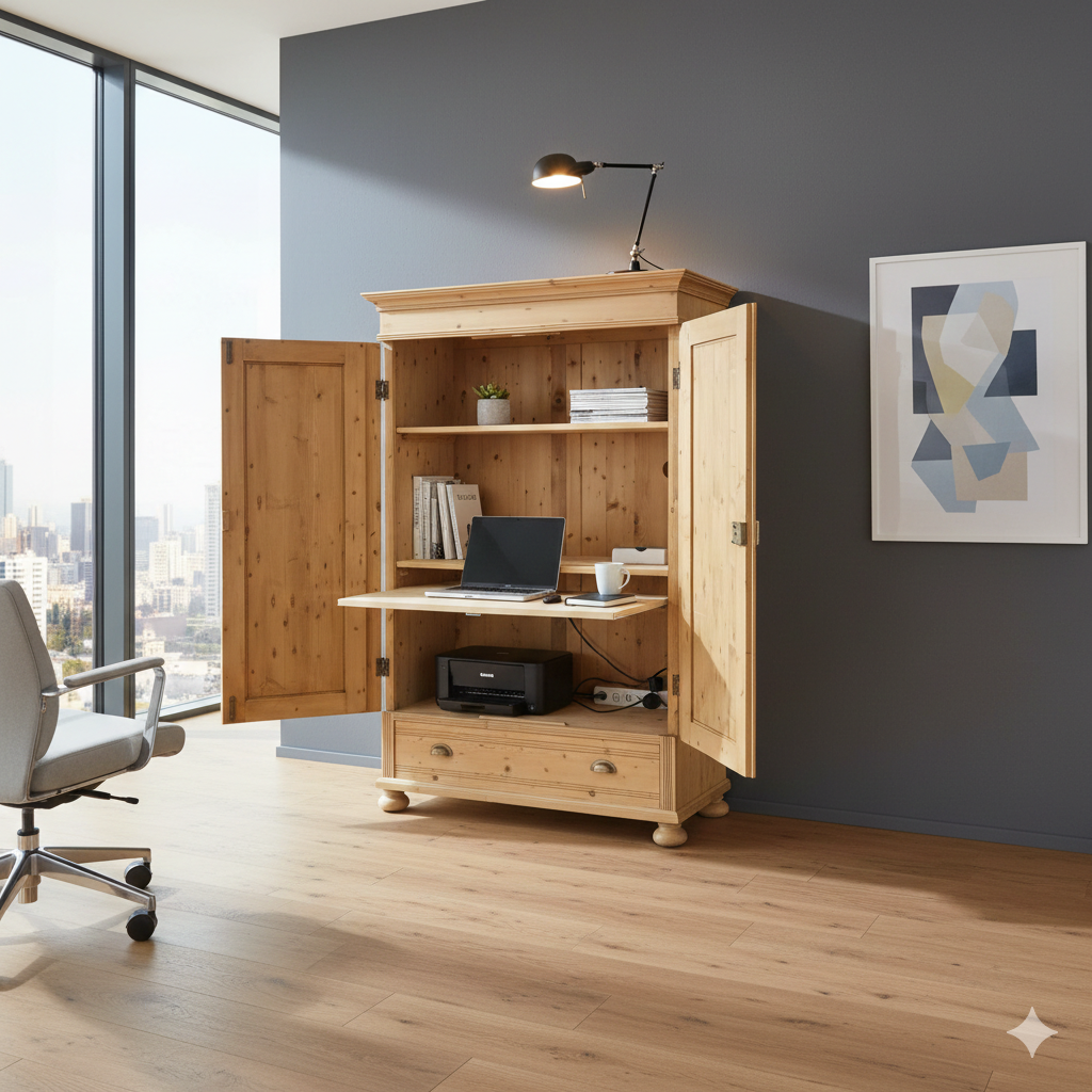 923,53€ Preis ohne SteuerSplendido armadio in stile Liberty (Jugendstil) restaurato, realizzato in pino massiccio (finitura a cera) del 1900 circa. Questo ex armadio guardaroba è stato trasformato in un funzionale mobile per computer. Si trova in ottime condizioni e presenta solo minimi segni di usura.