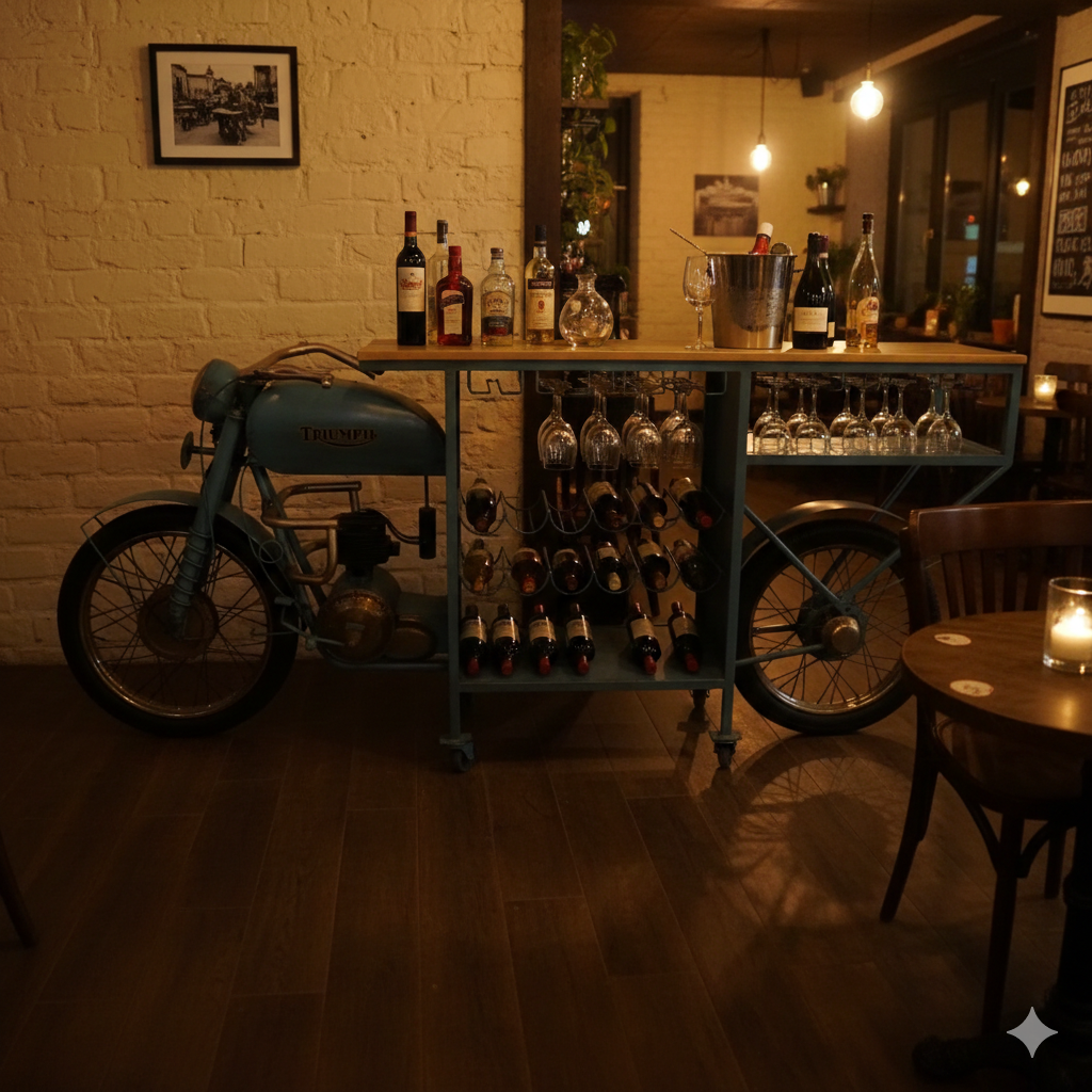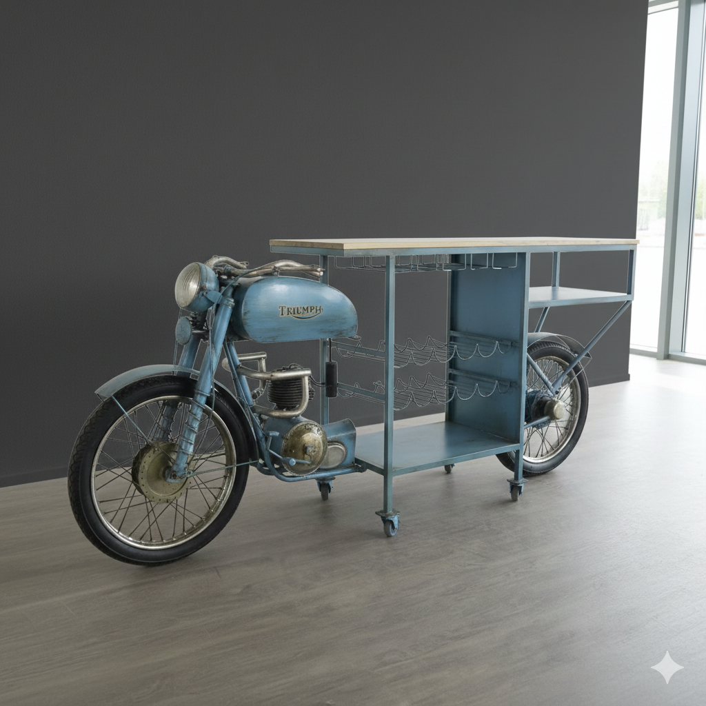 Diese einmalig gestaltete Minibar aus Original-Motorradteilen erhält seine besondere Wirkung durch die verwendeten Materialien, welche diesem Stück einen eigentümlichen Charakter verleihen und es zu einem Unikat machen. Machart und Farbton des Metalls tragen sehr zum optischen Wert dieses Möbels bei, das sowohl dekorative Möglichkeiten als auch genügend Stauraum bietet.   für 12 Flaschen geeignet 4 … Weiterlesen