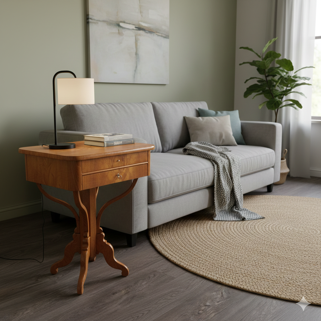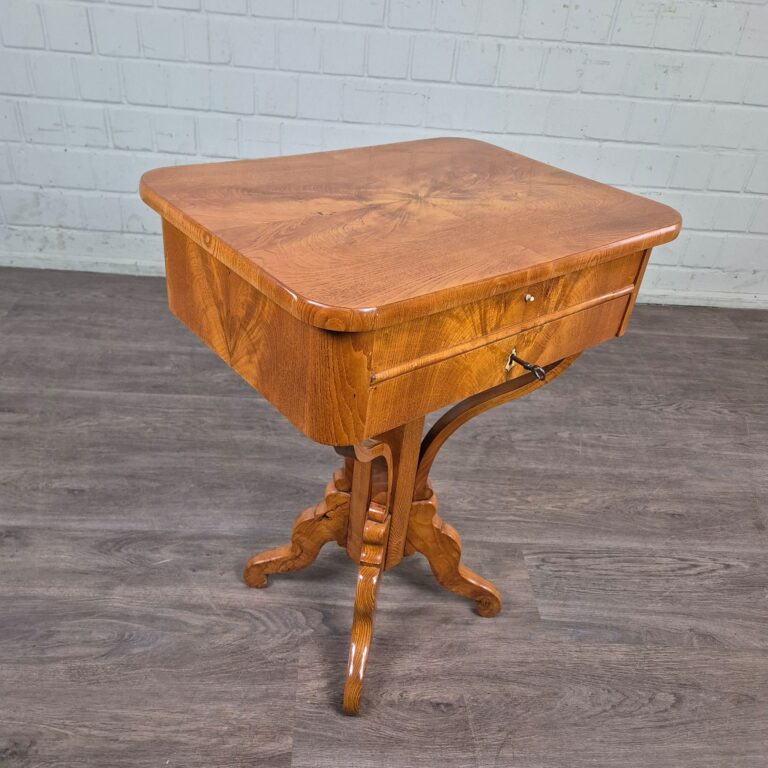 Restaurierter Biedermeier Nähtisch in Esche furniert und von Grund auf Schellack poliert von ca. 1830. Der Nähtisch befindet sich in einem sehr guten Zustand und weist nur minimale Gebrauchsspuren auf.   2 Schubladen Esche Furnier Schellack poliert Biedermeier ca. 1830   Maße:   Breite 0,58 m Höhe 0,76 m Tiefe 0,44 m