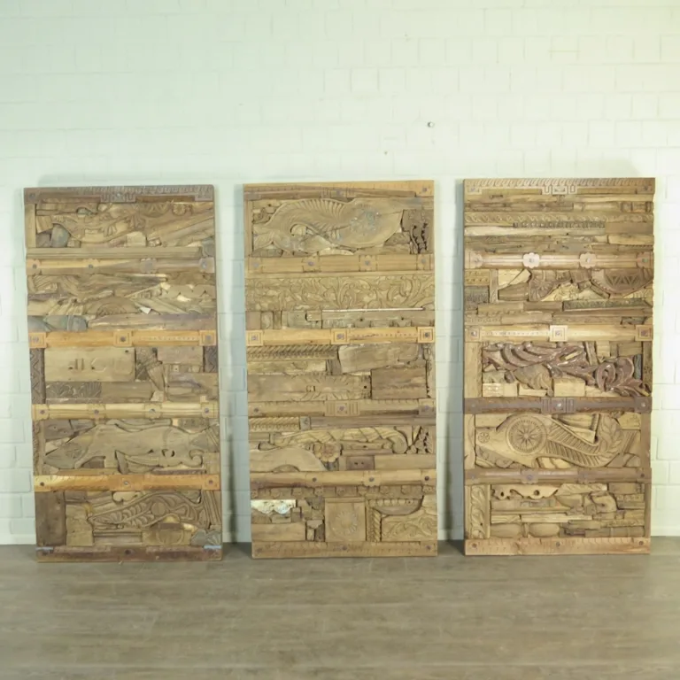 Wand-Paneele hergestellt aus verschiedenen, aus Indien stammenden, Holzelementen. Jede Paneele ist eine echtes Unikat. Sie kann als Wandverkleidung, aber auch als Wandbild verwendet werden. Sie sind mit vertikaler und horizontaler Aufhängung versehen.   Maße:   Breite 0,90 m Höhe 1,80 m Tiefe 0,05 m