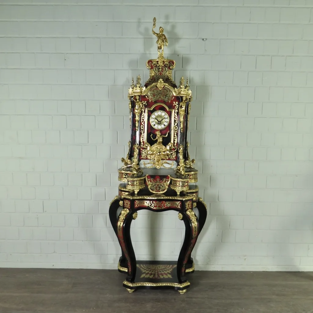 Große Pferde-Boulle Uhr mit passendem Konsolentisch. Die Boulle Uhr sowie der Tisch wurden mit verschiedenen Figuren und klassischer Ornamentik aus Bronze verziert.   Maße:   Breite 0,85 m Höhe 2,20 m Tiefe 0,50 m