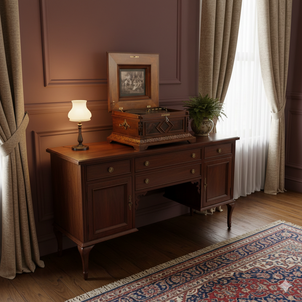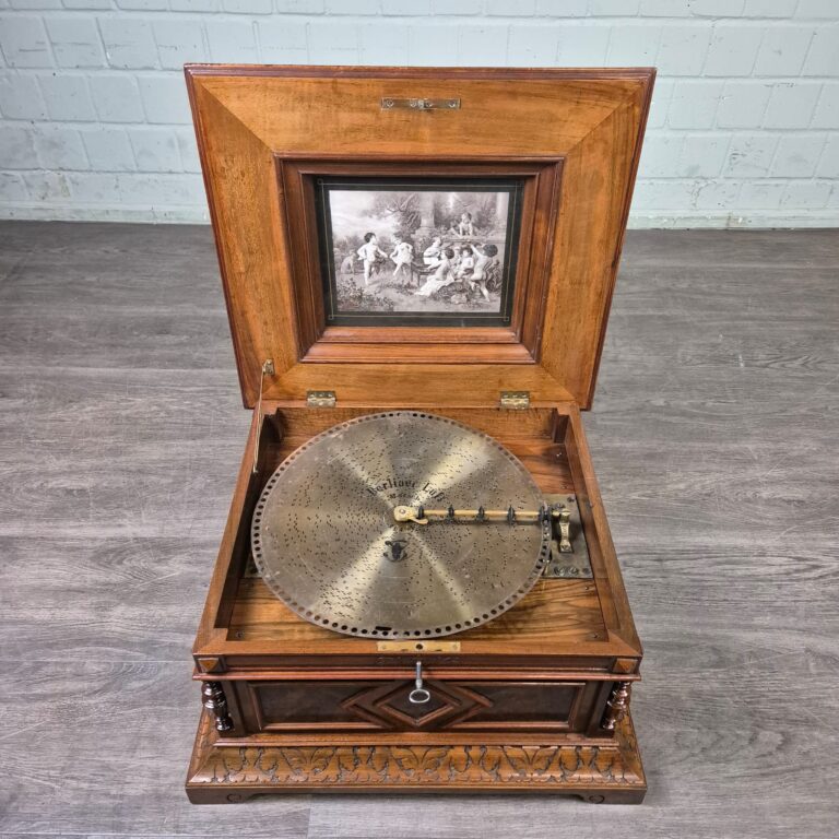 Restaurierte Polyphon Spieluhr in Nussbaum furniert und von Grund auf Schellack poliert von ca. 1880. Die funktionstüchtige Spieluhr befindet sich in einem sehr guten Zustand und weist nur minimale Gebrauchsspuren auf. Der mit Intarsien versehene Kasten befindet sich ebenfalls in einem sehr guten Zustand.   Hersteller Polyphon Doppelkamm inkl. ca. 20 Platten (Ø 40 cm) … Weiterlesen
