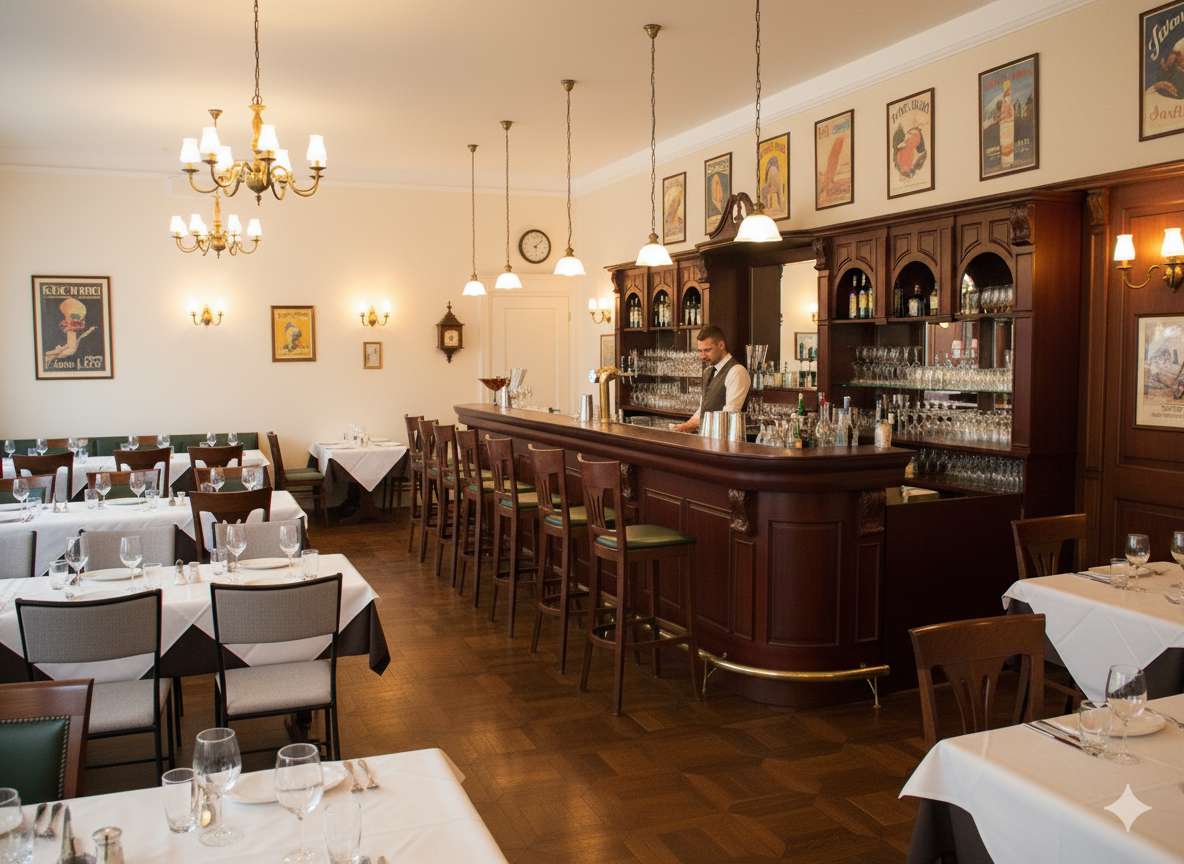 Die Theke Modell Queen aus Massivholz besticht durch ihre außergewöhnliche Thekenform, sowie dem stilvollen mit Spiegeln versehenen Rückwandbuffet.
