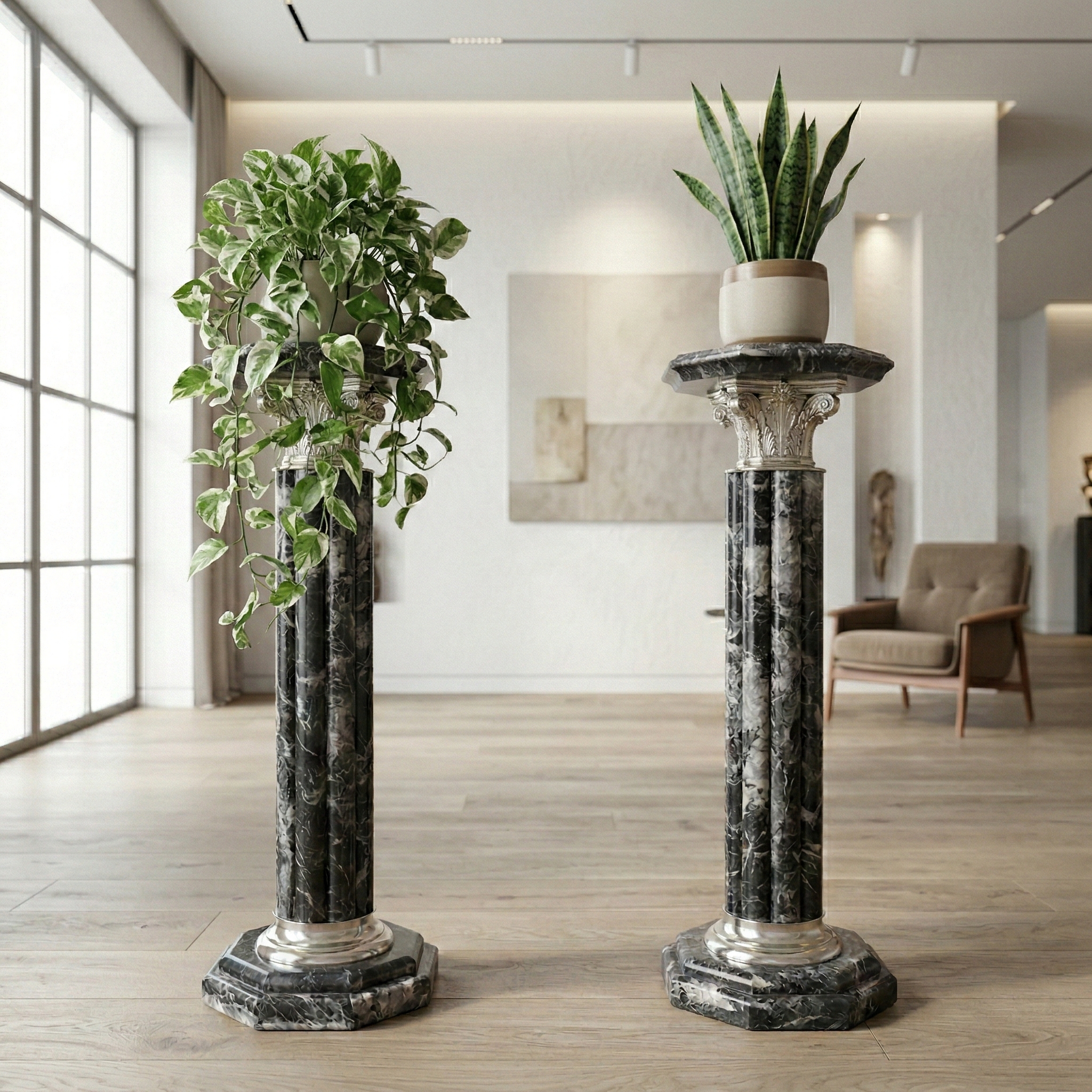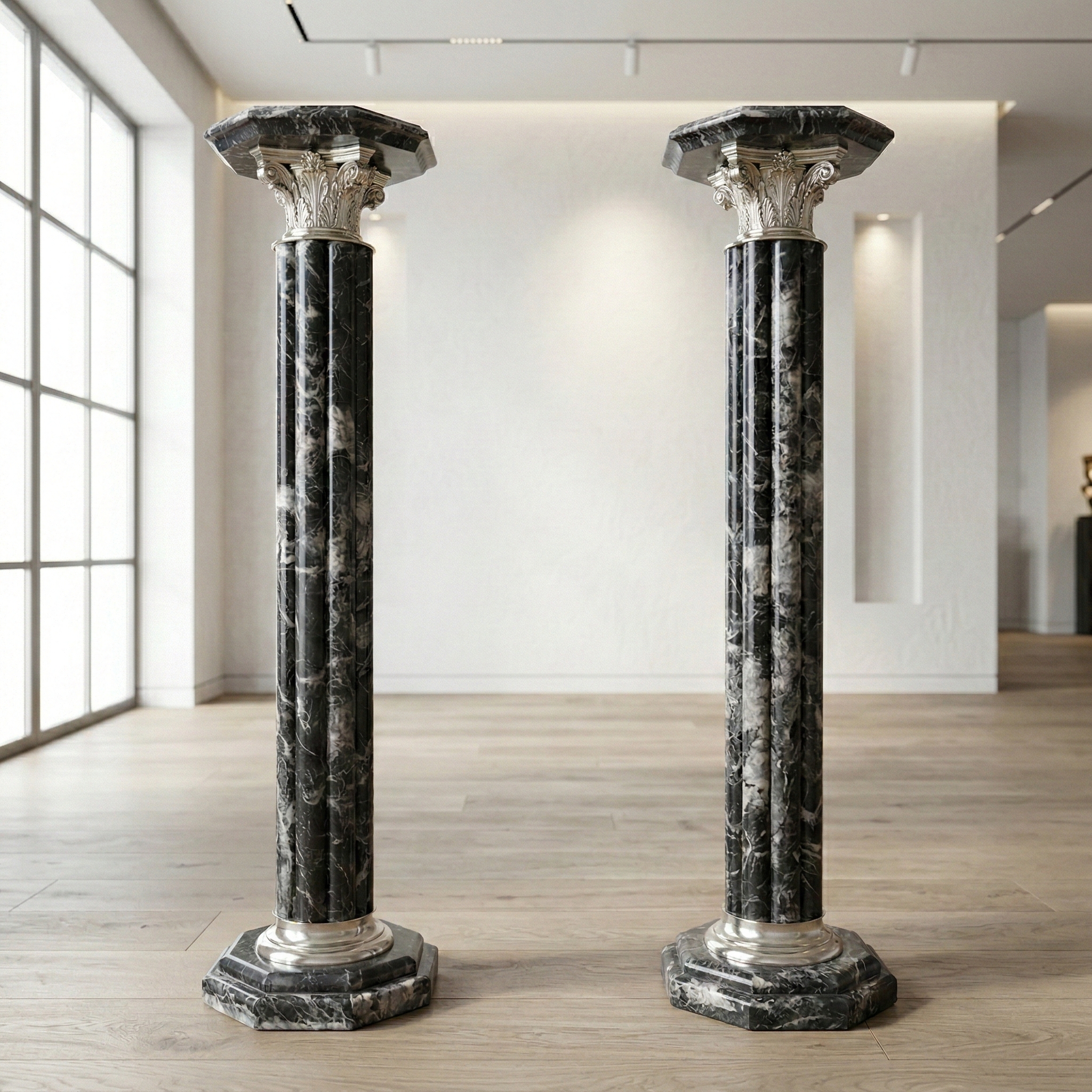 Hochwertige Säulen aus Marmor mit Verzierungen aus Chrom. Setpreis. Maße: Breite 0,30 mHöhe 1,12 mTiefe 0,30 m